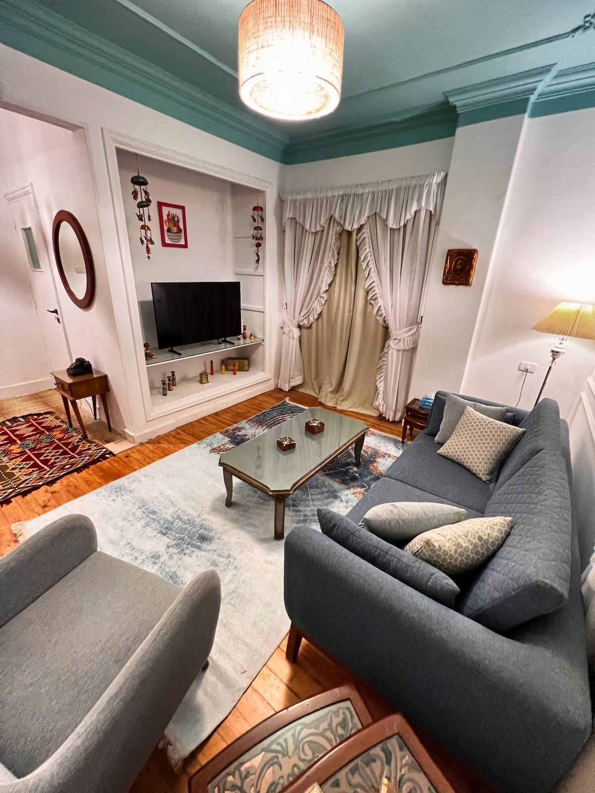 Welcome to our Deluxe 2-bedroom in Golden Gates Compound! Just 5 minutes from Maadi, 10 minutes from New Cairo and Nasr City, and 15 minutes from Cairo Airport and Heliopolis. Enjoy a fully equipped kitchen, stylish modern-boho decor, 24/7 security, and on-site amenities like coffee shops, restaurants, Carrefour, and a hospital. Relax with a 65-inch smart TV and high-speed Wi-Fi. Your Cairo adventure starts here—we can’t wait to host you!