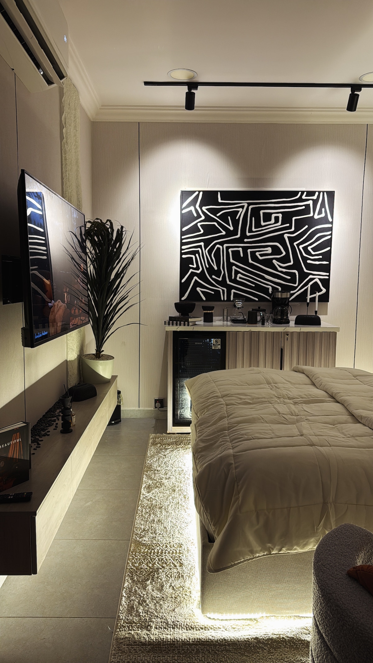 استمتع بتجربة فريدة من نوعها في غرفة نوم خاصة توفر الاسترخاء والراحة. تتضمن الشقة سريراً ومنطقة معيشة حيث يمكنك الاستمتاع بالمشاهدة على شاشة ذكية مقاس 65 بوصة. هناك أيضًا مطبخ منفصل وقهوة لتلبية جميع احتياجاتك. غرفة نوم و صالة فندقيه دخول ذكي بتصميم مريح 5 دقائق مشي الى الاحساء مول 5 دقائق مشي لحديقة الملك عبدالله 10 دقايق بسيارة لجامعة الملك فيصل 10 دقايق بسيارة لكلية الادب 10 دقايق بسيارة لمطار الاحساء الدولي 15 دقايق بسيارة لمحطة القطار والكوفيهات قريبة من مطاعم