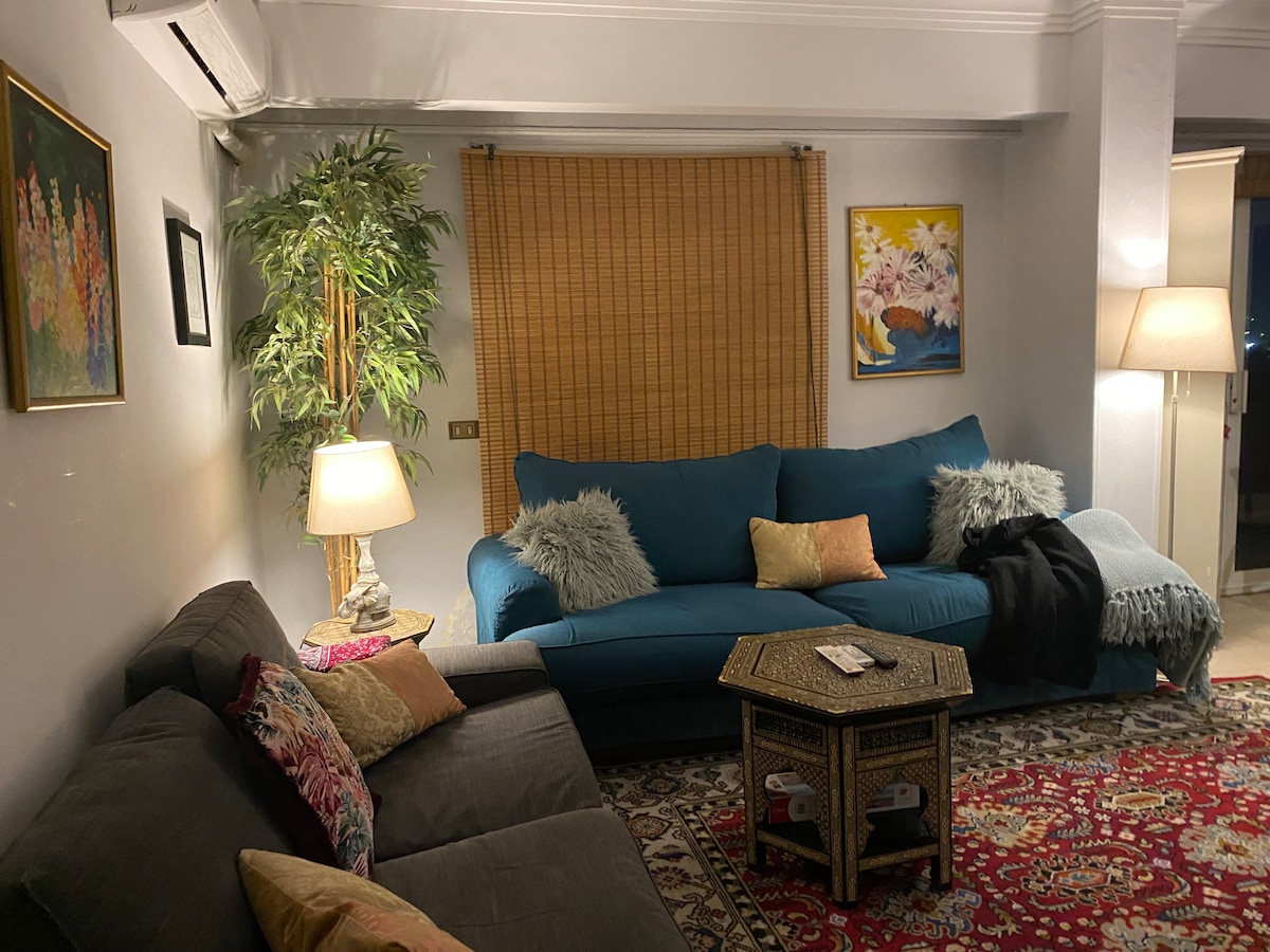 Welcome to our cozy Boho-style apartment in a peaceful, upscale neighborhood! Enjoy a bright space with lush plants, parquet floors, and a fully equipped kitchen. Relax with a 65-inch Smart TV and take in the beautiful garden view. Just a 3-minute walk to local shops and 20 minutes to downtown and the Egyptian Museum, it's the perfect retreat where comfort meets convenience!