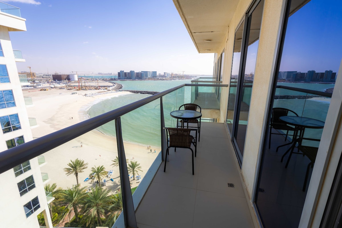 Fully renovated one-br suite steps from the free Beach, Golf course, Marina and close to luxury hotels Ritz Carlton, Waldorf, Hilton. 20 m. drive to Hajar Mountains. 24 hours Concierge/lockbox access. Free Parking. Free: Gym, pool ,kids pool and 2 kids play areas . Gorgeous large terrace with lounge seating and full sea view. Sleeping: 1 King size bed+ 2 sofa beds. Kitchen: cooker, w/machine, Fridge, Nespresso, toaster. Other: Wifi, 55' Smart TV , Netflix, beach towels, umbrella