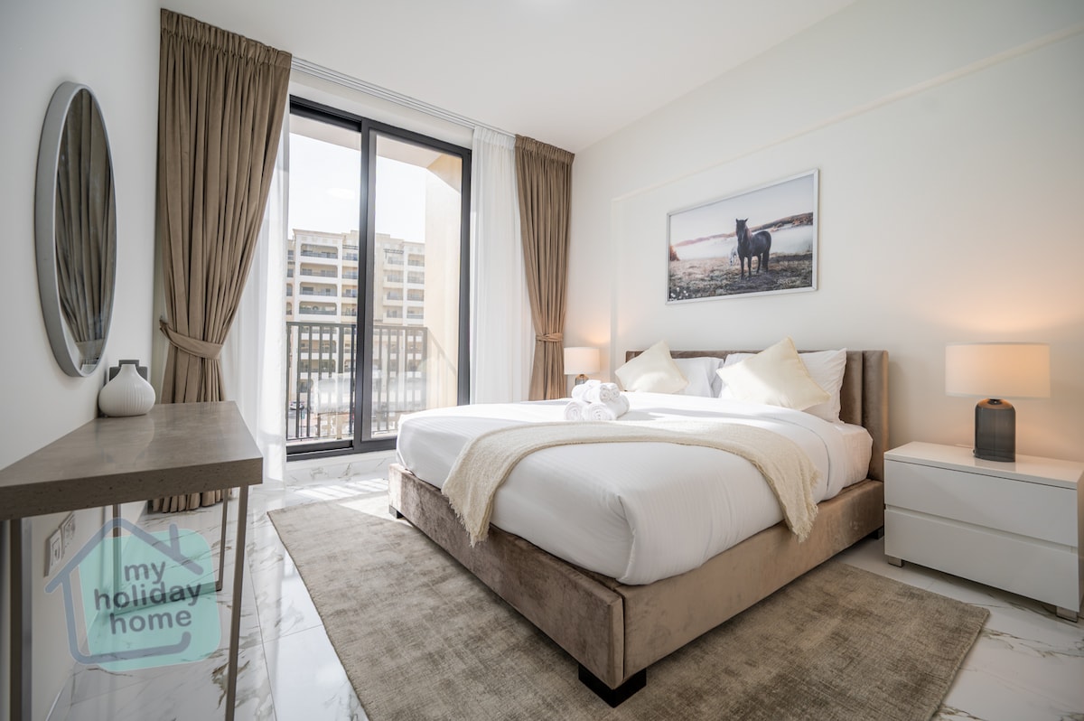 Bright and stylish coastal escape in Mina Al Arab! Perfect for couples, families and remote workers. What You’ll Love: • Sunny open living space with Smart TV + Netflix • Cozy queen bed + sofa bed to sleep 3–4 guests • Fully equipped kitchen (coffee machine included ☕) • Fast Wi-Fi — ideal for remote work • Quiet and family-friendly community • Self check-in for easy arrival Relax, work or explore — comfort and coastal vibes all in one place 🌊✨