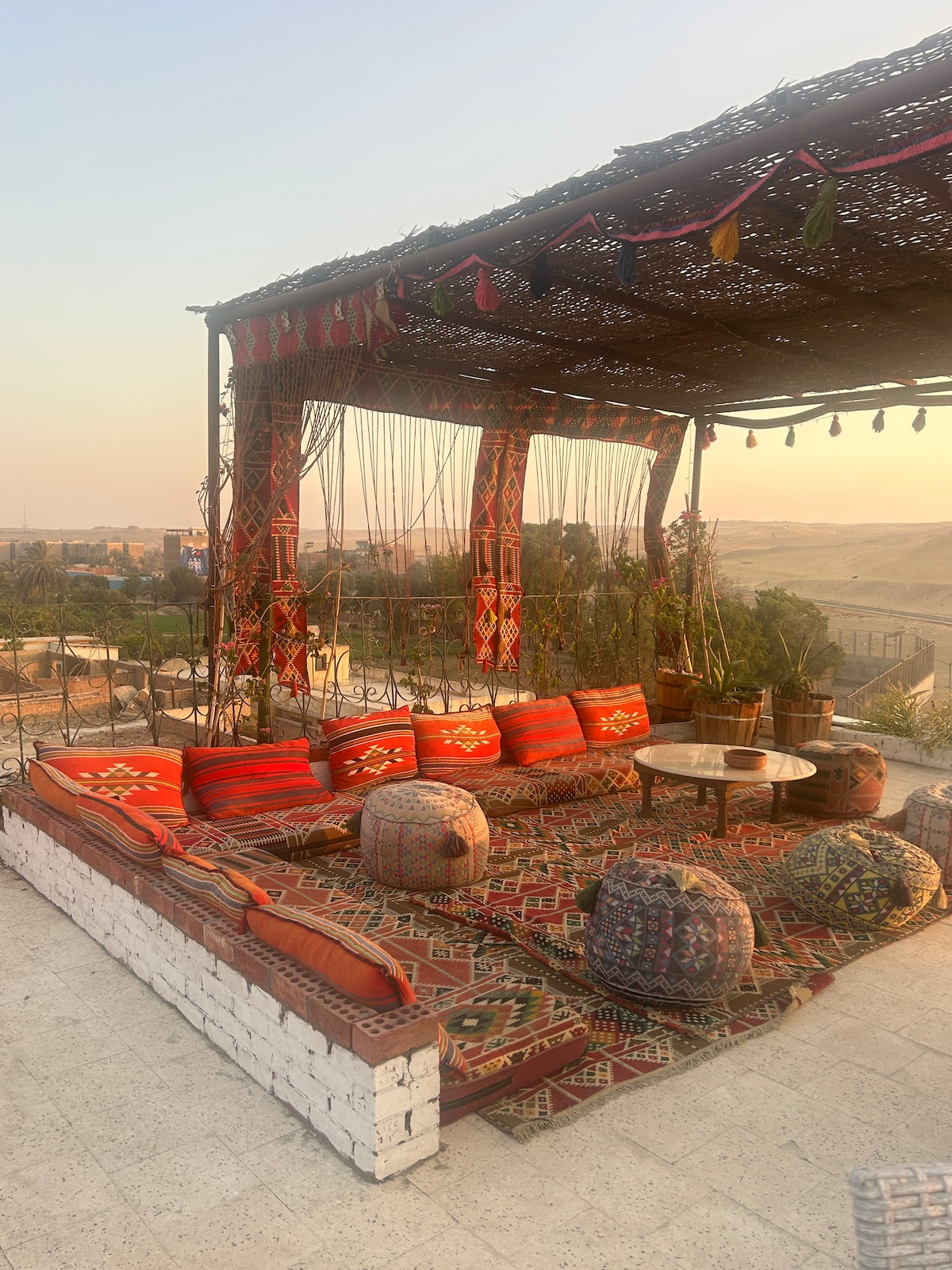 Escape to a one-of-a-kind artistic retreat, where nature and design come together in perfect harmony. This handcrafted studio, just a 5-minute walk from the Pyramids of Giza, offers an immersive experience with natural materials, bespoke handmade furniture, and breathtaking pyramids views right from your private jacuzzi.