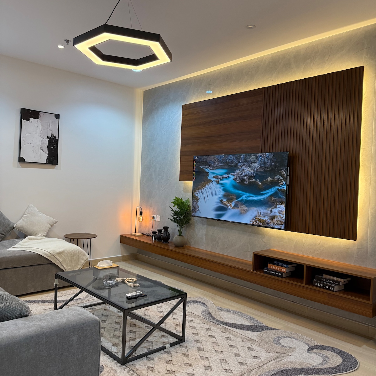 This unique place has a style all its own.A stylish and modern apartment with a unified design between the living room and bedroom. The space features cozy furniture and elegant decor that creates a relaxing atmosphere. Equipped with a 65-inch Smart TV with access to all major streaming platforms, and high-speed fiber internet. Enjoy a Nespresso coffee machine, electric kettle, and a compact kitchen with a stovetop and toaster for your daily needs. A perfect stay for both work and relaxation.