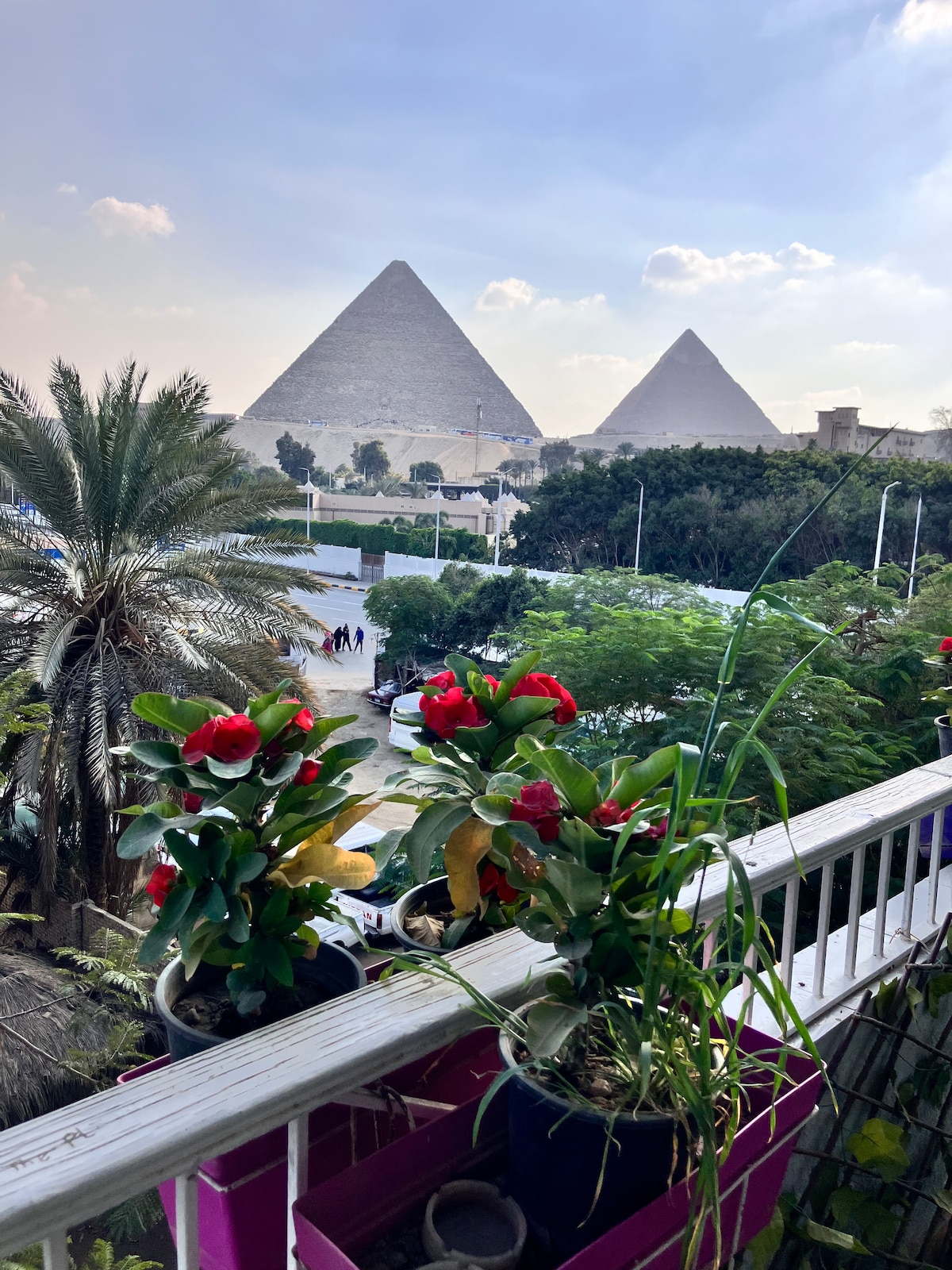 This apartment is located at only 5 min by walk from the Sphinx and Pyramids entrance gate with view of the pyramids from balcony , are in a quiet location close to many restaurants, shops, fruit shops, mall shop (local and touristic), mini markets, and pharmacies, Apartment is air conditioned, unlimited fast internet , Full accessories clean sheets, fresh towels & quite atmosphere. Its probably the best place to enjoy pyramids view