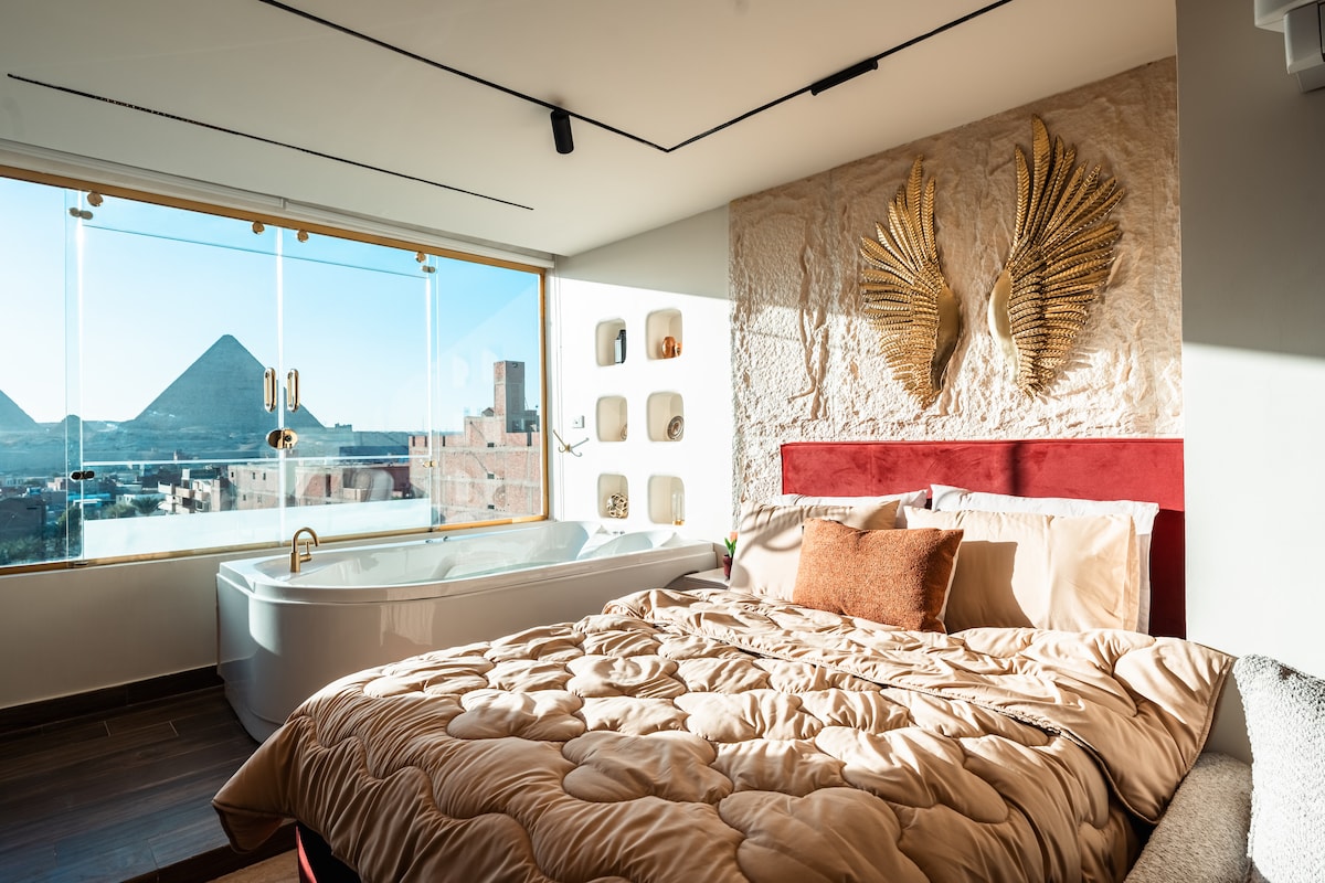 Enjoy your stay with Panoramic View of the Giza Pyramids,Sphinx Yes! view and pictures are all 100% real. (Be sure to check out our other listings too) Indulge in a stunning view of all the Giza Pyramids from anywhere within this contemporary oriental studio or while relaxing in the Jacuzzi. It is also a 10 min walk from the Pyramids entrance gate. To make the most of your trip, make sure to check out our experiences! We're committed to providing our guests the magical hospitality they deserve.