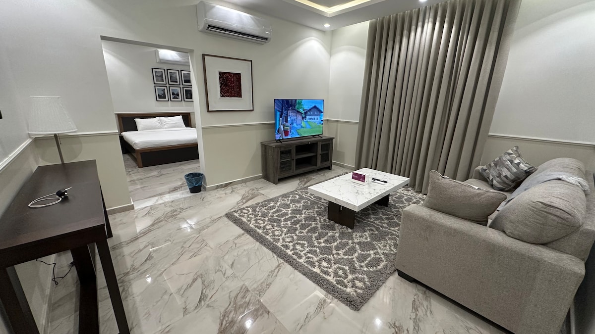 Enjoy our spacious apartment in the heart of Madinah, perfectly located on King Abdullah Road,Al Madinah near the prophets Mosque, restaurants, cafes and other Tour site. 1.Clean & Spacious Living room with top tier furnishings 2.Large flat-screen TV 3. 2 Clean bedrooms with plush linens 4. Free Wi-Fi 5. Fully loaded kitchen with high end cooking ware and dinning area. 6. Two private bathrooms with rainfall shower. 7. Free Parking Space Perfect for couples and families on Short-Long stays.