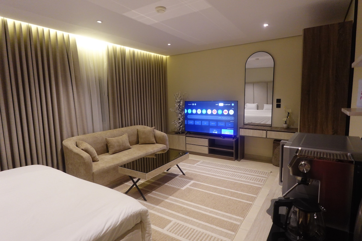 استوديو ماستر فاخر يحتوي على: • سرير ماستر مريح لضمان نوم هادئ. • منطقة جلوس أنيقة مع كنب مريح. • تلفزيون عالي الوضوح للاستمتاع بالمشاهدة. • ركن قهوة مجهز لتحضير المشروبات الساخنة. • مطبخ جاهز . • حمام خاص مجهز بكافة الاحتياجات من شامبو، صابون، وجل استحمام لراحة تامة. الاماكن القريبه منه : الحرم النبوي الشريف اقل من ١٠ دقائق محطة قطار الحرمين اقل من ١٠ دقائق مطار الامير محمد بن عبدالعزيز اقل من ١٥ دقيقة