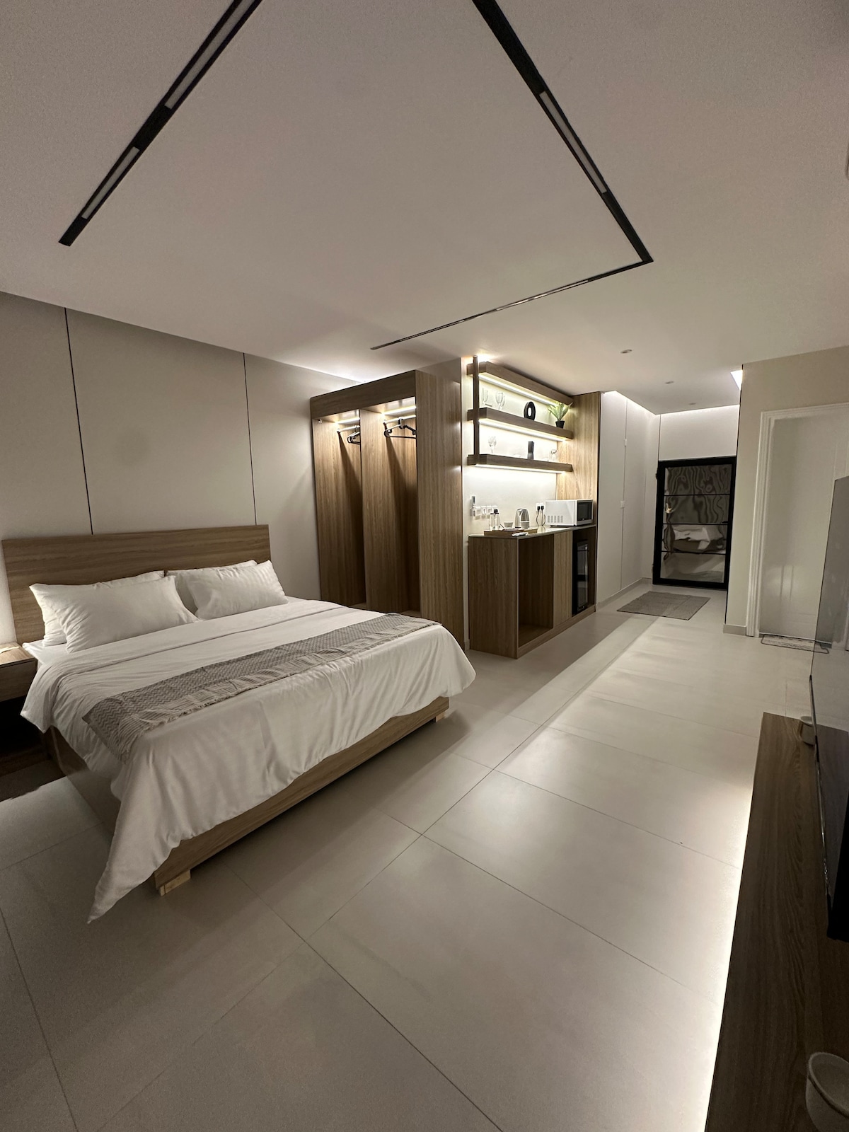 استديو مميز وقريب من المسجد النبوي، يتميز الاستوديو بشاشة ذكية في المنتصف تقسم المساحة إلى منطقتين: جهة للجلوس وجهة للنوم، مع إمكانية تدوير الشاشة بشكل دائري للاستمتاع بها من الجهتين. يتمتع الاستديو بموقع قريب من الحرم النبوي الشريف (حوالي 15 دقيقة مشيا على الأقدام)، كما تتوفر محطة عربات غولف بجانب السكن تبعد 3 دقائق مشيًا، وتتجه إلى مسار الحرم النبوي أو إلى مسجد قباء والعكس (تستغرق رحلة العربات ٣-٥ دقائق فقط إلى الحرم )حيث ان تتوفر دراجات كريم ايضا خيار مثالي لإقامة عملية ومريحة بالقرب من الحرم