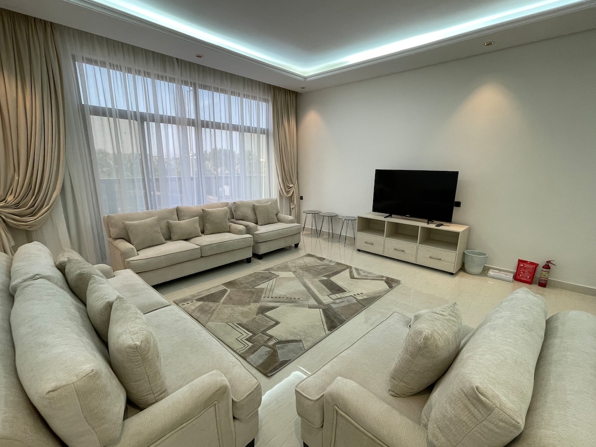 انعم بالهدوء والاسترخاء والخصوصية بصحبة عائلتك في هذا المسكن الهادئ المتكامل الذي يحتوي على غرفتين نوم ومجلسين وصالة بشاشة ذكية ومطبخ متكامل بفرن وثلاجة وغلاية ماء ومايكرويف وغسالة ملابس وفناء واسع يحتوي على مسبح وألعاب أطفال .