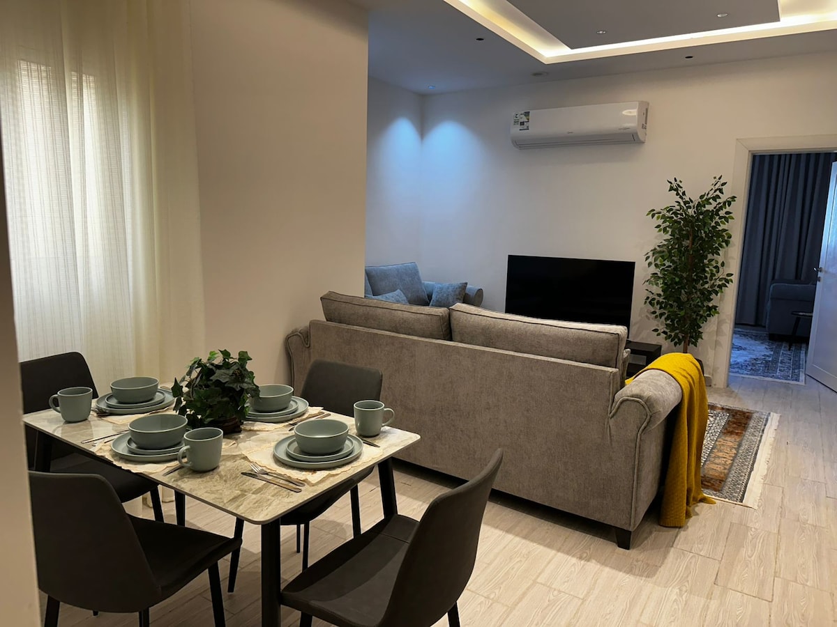 Leaves – Luxury Stay in the Heart of Madinah 🔹 Prime Location: • 🚗 10 min to Quba Mosque 🕌 • 🚗 10 min to the Prophet’s Mosque 🔹 Apartment Features: • 🛏️ 2 Elegant Bedrooms: • Master bedroom with a luxurious bed • Twin bedroom for family or guests • 📺 65” Samsung Smart Qled TV for top entertainment • 🍳 Fully equipped modern kitchen • 🆕 Stylish, brand-new design 🔹 Extras: • 🧹 Daily cleaning & sanitization • ❄️ Fast Wi-Fi & central AC ✨ Book now for an exclusive luxury stay!