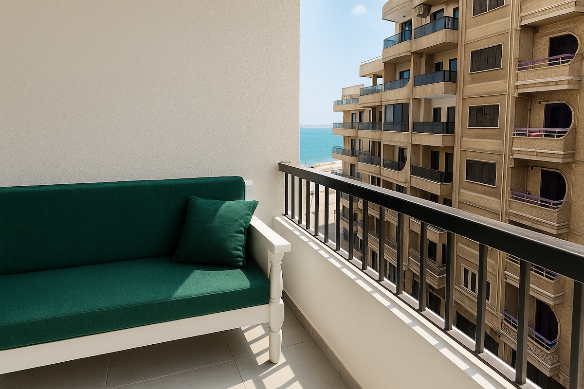 A distinguished apartment on the beach of Alexandria in the Montazah area. It consists of three bedrooms with 6 beds, two bathrooms, a large hall containing a dining room, a salon, and a living room. In addition to a sea view across the width of the hall. And a large balcony containing a sofa and chairs made of wicker and classic beads. The apartment is located on the ninth floor, giving it a unique view of the beach that you will never see before.