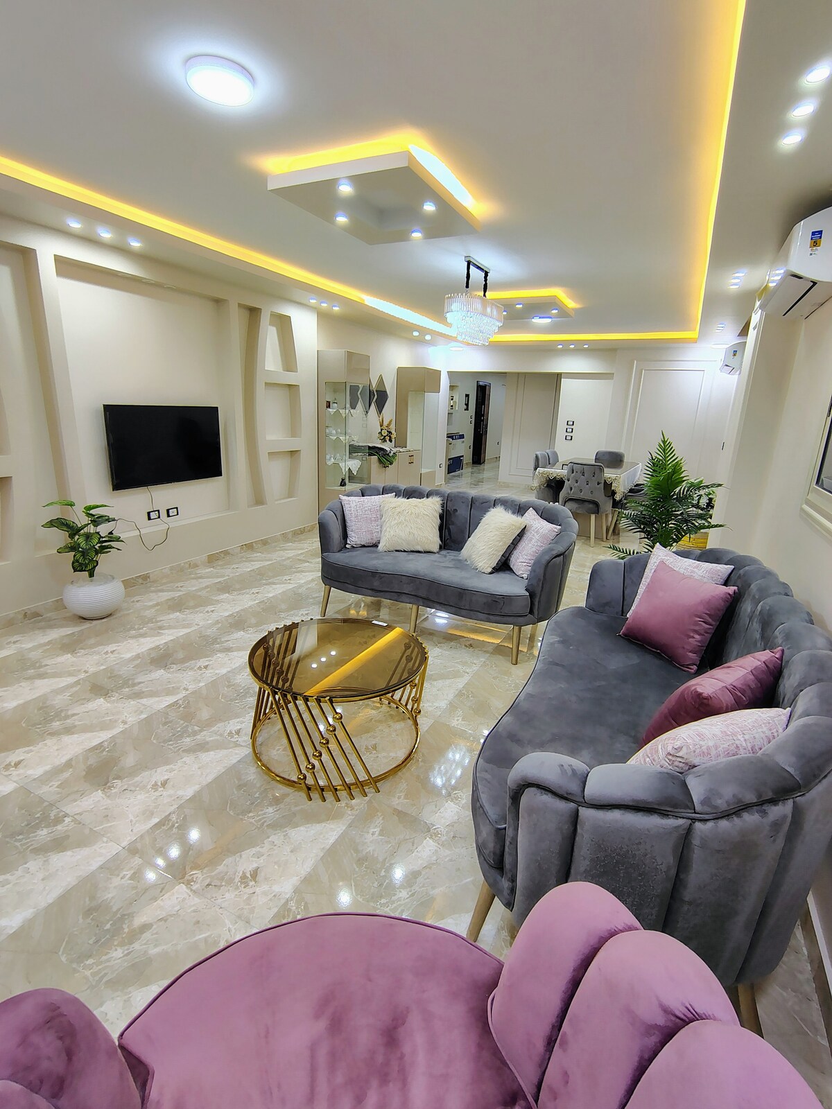 beautifully styled 3-bedroom apartment in the heart of Nasr City, perfect for families and groups. Enjoy a spacious balcony, fast Wi-Fi, modern kitchen, and comfy lounge—just steps from top malls, restaurants, and all city attractions. 🏡 The Space Located on the 4th floor of an elevator building, this newly furnished apartment is a true blend of style and function: 🛏 Bedrooms Master Bedroom: King-size bed, en-suite bathroom, large dresser, AC, and soft linens.