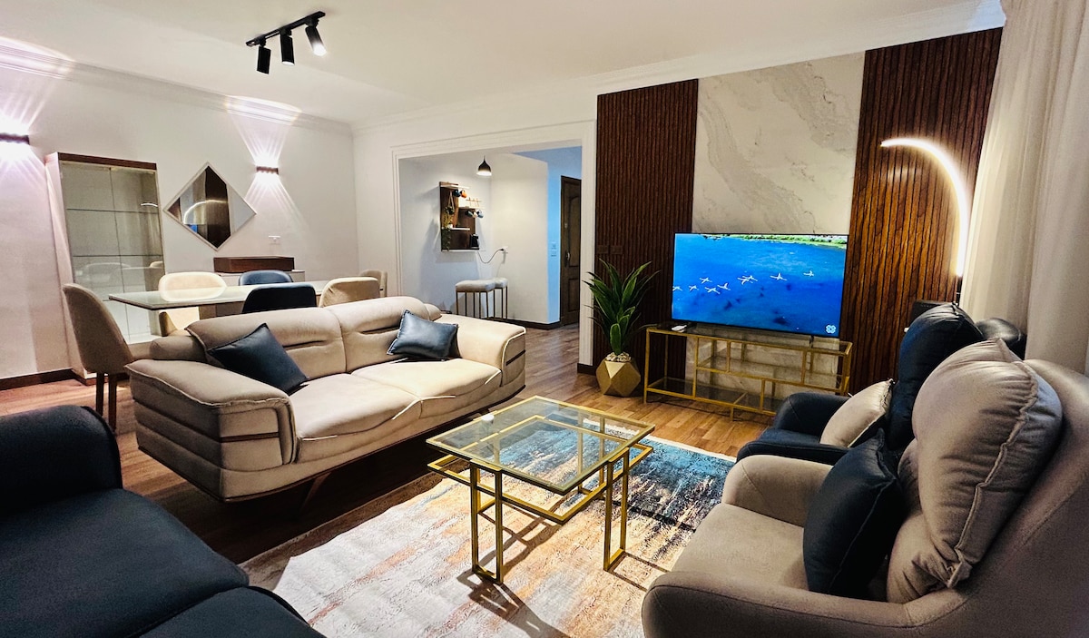 beautifully styled 3-bedroom apartment in the heart of Nasr City, perfect for families and groups. Enjoy a spacious balcony, fast Wi-Fi, modern kitchen, and comfy lounge—just steps from top malls, restaurants, and all city attractions. 🏡 The Space Located on the 4th floor of an elevator building, this newly furnished apartment is a true blend of style and function: 🛏 Bedrooms Master Bedroom: King-size bed, en-suite bathroom, large dresser, AC, and soft linens.