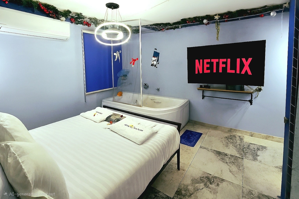 This cozy studio bedroom offers a perfect blend of comfort and functionality. The room includes a comfortable bed, ample wardrobe space, and a small dining nook ideal for intimate meals or work sessions. With direct access to a spacious open-air roof lounge, the room provides a unique connection to the outdoors, making it ideal for unwinding after a long day. The room’s simple yet warm decor adds a homely touch, creating a peaceful retreat within the bustling city.
