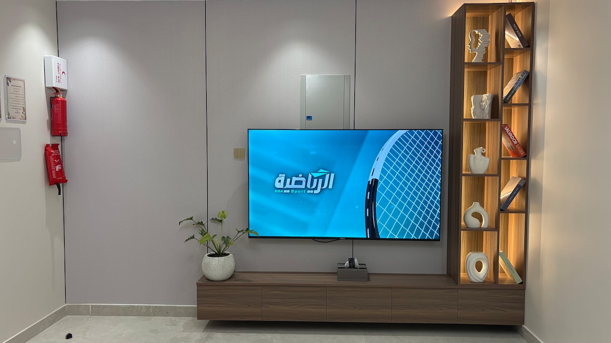 A comfortable and quiet studio apartment with quick self-check-in; featuring a master bed and a sofa/extra bed; a TV with Wi-Fi, and a bathroom; conveniently located near all services, cafes, and restaurants; and 30 minutes from Prince Nayef Airport.
