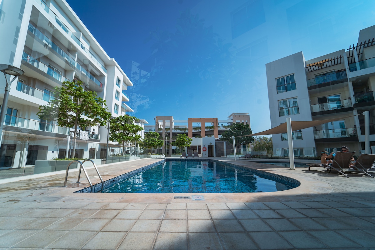 New 1 Bd flat with balcony, living area & 2 toilets.Nice furniture. Equipped with high speed WiFi, bed and dressing,sofa, 50 inch smart TV, satellite and free Netflix access, iron machine, hair dryer,vacuum cleaner, duct AC, ceiling with LED spot lights . You can enjoy the free swimming pool, gym & kids playground and BBQ cooking area. 5min drive from shopping malls, 15-20min from airport. 20min drive from beach, 20min drive from the old Market, next to sand dunes view.
