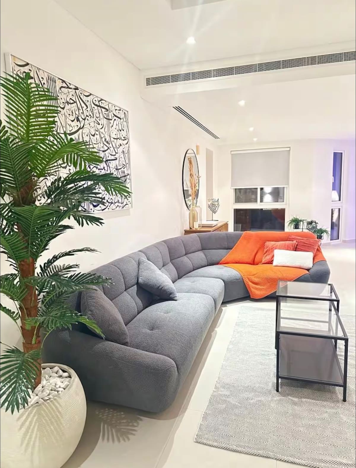New 1 Bd flat with balcony, living area & 2 toilets.Nice furniture. Equipped with high speed WiFi, bed and dressing,sofa, 50 inch smart TV, satellite and free Netflix access, iron machine, hair dryer,vacuum cleaner, duct AC, ceiling with LED spot lights . You can enjoy the free swimming pool, gym & kids playground and BBQ cooking area. 5min drive from shopping malls, 15-20min from airport. 20min drive from beach, 20min drive from the old Market, next to sand dunes view.