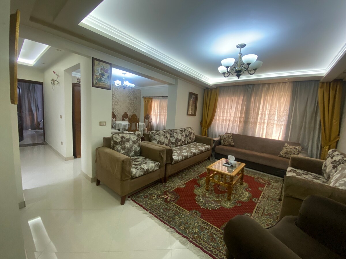 5 minutes from cairo international airport An 120 meter apartment with 2 bedrooms including 2 beds each (1 king bed and 3 medium beds) , 1 bathroom and kitchen with 2 fridge and dishwasher. Including elevator. Two TV with receiver, Washing Machine (clothes), 2 Vacuum cleaners, water heater, portable ladder, 2 fans and 2 landlines