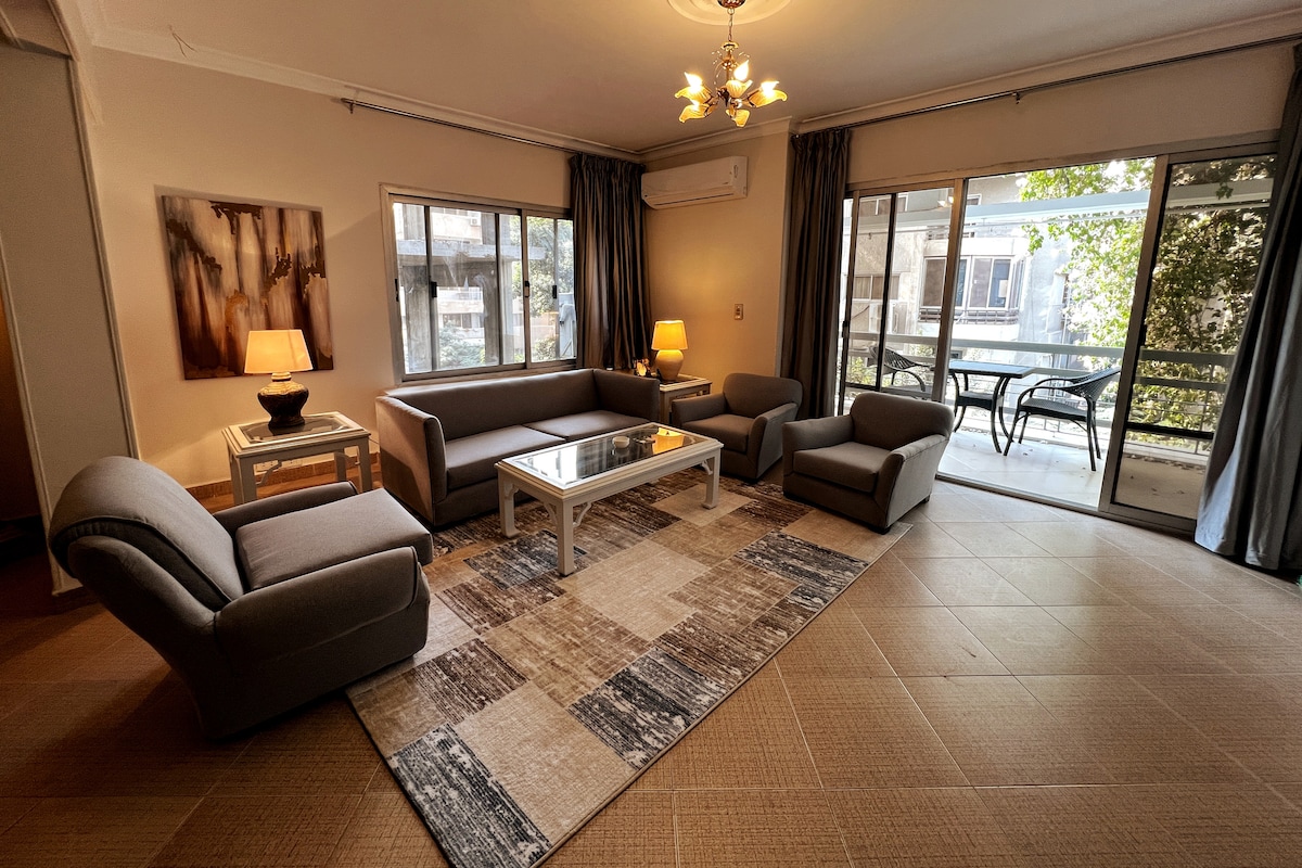 Welcome to your luxurious Heliopolis home with a one-of-a-kind garden view, a novelty in Cairo that you can't easily get in a busy city! This two-bedroom apartment, situated in a prime location, sleeps six people and offers easy access to the city's vibrant attractions and cultural landmarks. As long as you stay here, no matter the reason or the timeframe, you will have a great time!