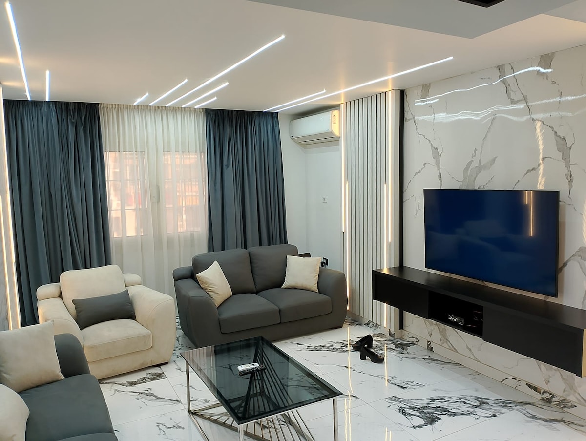 Welcome to our serene ground floor garden flat in Alburouj Compound. Featuring two comfortable bedrooms, modern bathrooms, and a large open-plan living area, our flat is perfect for relaxation. Enjoy cooking in the fully equipped open island kitchen or unwind in the private garden. With high-speed Wi-Fi, air conditioning in every room, and close proximity to local amenities, our stylish retreat offers the ideal blend of tranquility and convenience.