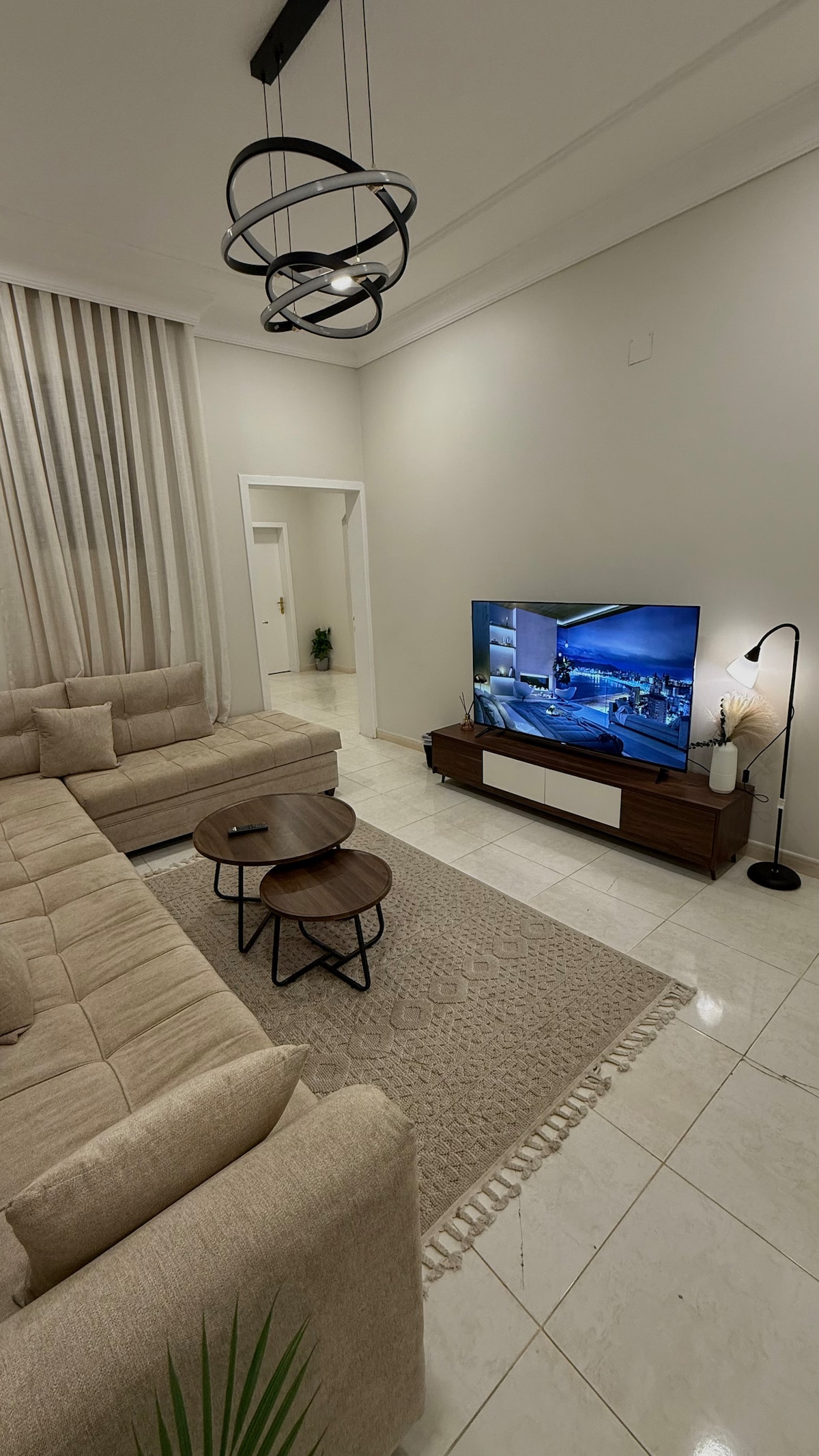 شقة واسعة وأنيقة لغير المدخنين بدخول ذكي وموقع مميز وقريب من المطاعم والكافيهات (ستاربكس، لوفت، البيك..) الشقة تحتوي على صالة جلوس، وصالة طعام، وغرفتين نوم ماستر، ومطبخ وفناء خارجي هادئ للإستجمام في الهواء الطلق. المطبخ صمم بأناقة ليلبي إحتياجاتك ومجهز بفرن وثلاجة وأدوات طبخ وركن للقهوة. ركن القهوة يتضمن آلة قهوة وخيارات متعددة من أنواع القهوة والشاي بما في ذلك القهوة العربية. غرفة الجلوس تحتوي على شاشة تلفاز ذكية بحجم 60 بوصة تحتوي على جميع المنصات الرياضية والترفيهية شاهد vip الرياضية، نتفلكس