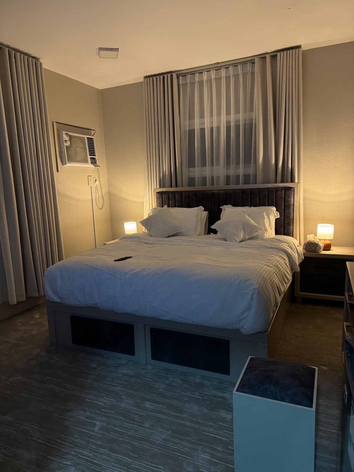 تم تصميم هذا المسكن ليتناسب مع احتياجك ويصنع رفاهيتك وراحتك بكامل التفاصيل ، يتميز بالخصوصية والأمان بدخول ذكي واحتياجات غرفة النوم لقضاء ليلة هانئة وسرير ماستر وشاشة ذكية 60 بوصة وشبكة واي فاي ويتميز بموقعه المميز وقربه من سكة القطار ومركز تسوق يبعد تقريبا 4 كيلو صمم بألوان مريحة وأثاث مودرن ليصنع راحتك ... اتمنى لك قضاء ليلة سعيدة ...