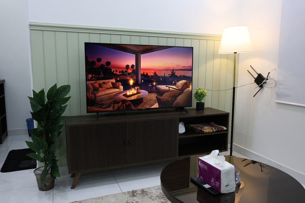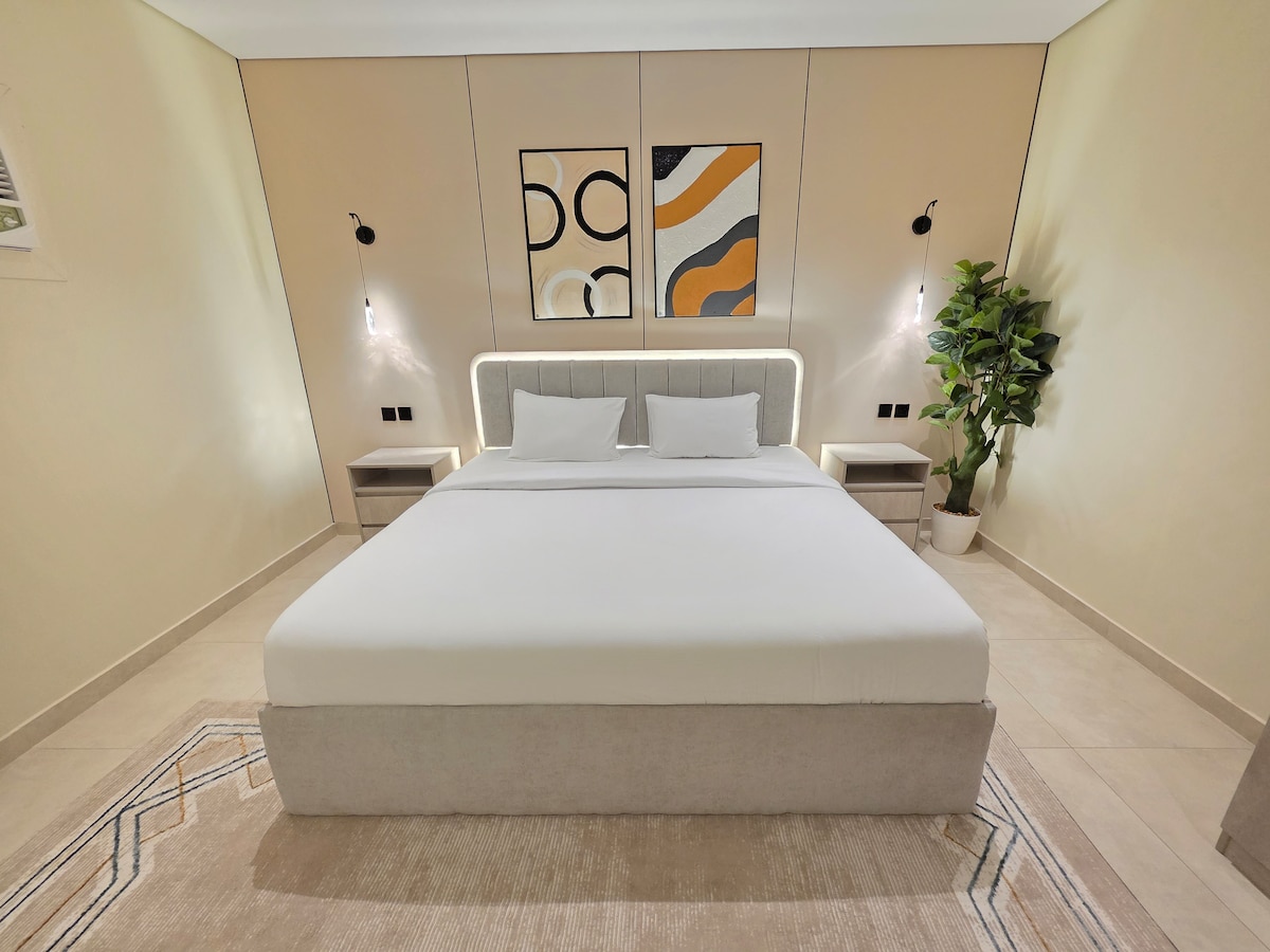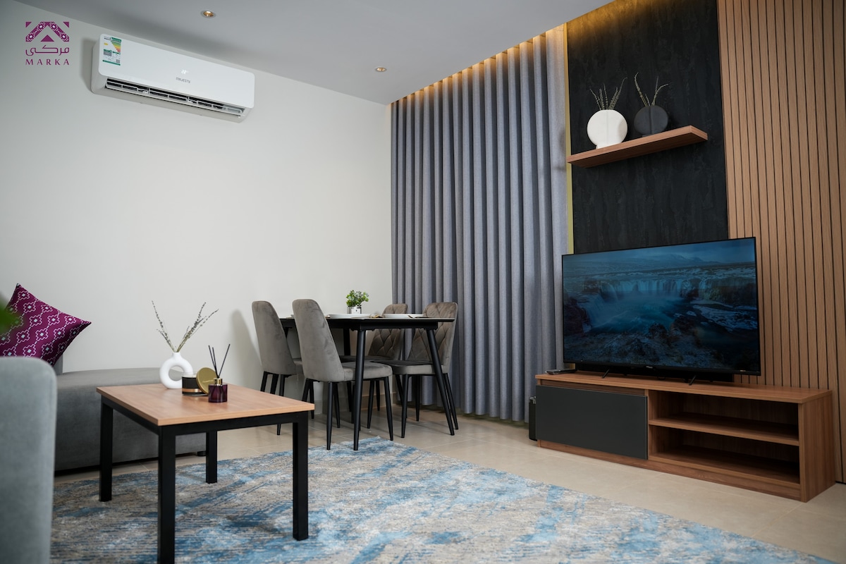 Enjoy our spacious apartment in the heart of Madinah, perfectly located on King Abdullah Road,Al Madinah near the prophets Mosque, restaurants, cafes and other Tour site. 1.Clean & Spacious Living room with top tier furnishings 2.Large flat-screen TV 3. 2 Clean bedrooms with plush linens 4. Free Wi-Fi 5. Fully loaded kitchen with high end cooking ware and dinning area. 6. Two private bathrooms with rainfall shower. 7. Free Parking Space Perfect for couples and families on Short-Long stays.