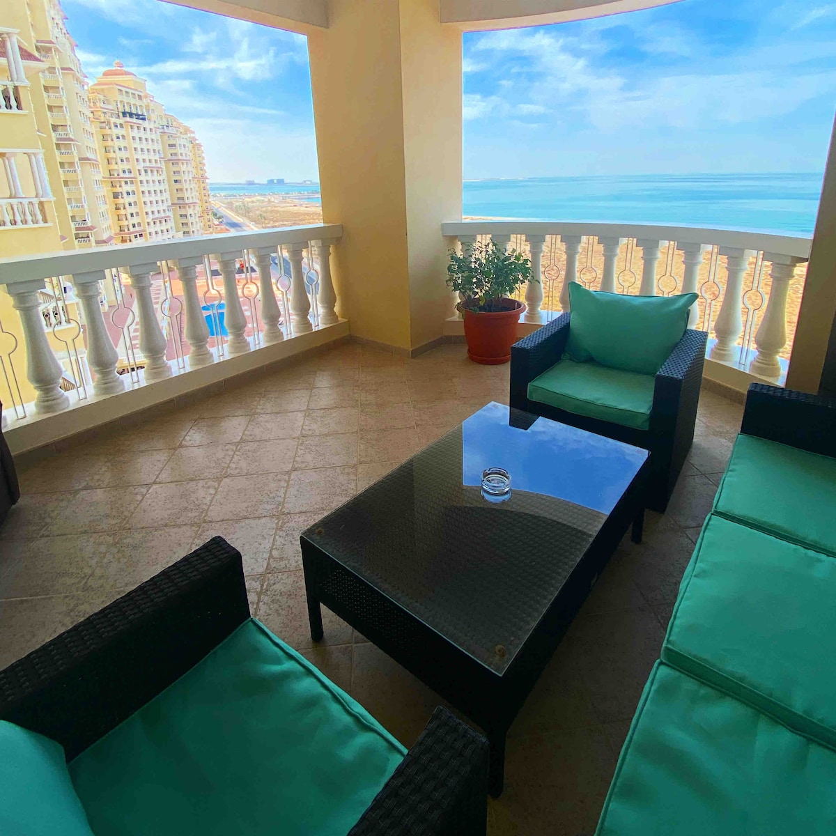 Feel the Holiday vibe in this stylish 1 Bed apartment. Enjoy sea view from all of the windows : when you wake up or while you have a coffee in the living room You will love big balcony with lounge: have a breakfast with sea view or enjoy your drinks after long beach day listening the waves. After long day - you will sleep well in king size , 5* hotel quality bed Perfectly located:2 min walk from the beach , Marina and restaurants walk. Market store at the building entrance , opened 24h