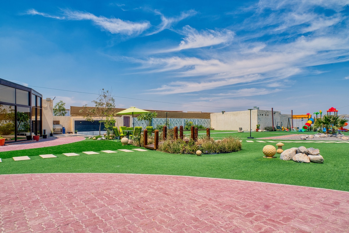 Dar 66 Digdagga Pool Chalet is a 1BR/1.5 bathrooms self-catering villa. This one-floor private villa features a fully private 5.5x3m swimming pool and 1.5x1.5m jacuzzi (both temperature-controlled), ensuite king-size bed, and pergola with gas BBQ. It is located in a mixed area with some families, some farms, and some shared labor accommodations. Driving on a sand road for about 5 minutes is required to get to the chalet.