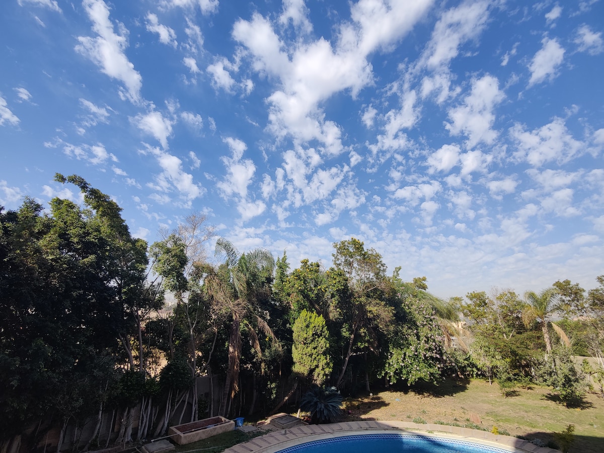 We offer: • Gym, garden, and ping pong table • Help arranging comfortable full-day transportation to the Grand Egyptian Museum, Pyramids, or Old Cairo Explore Cairo by day and unwind away from the noise by night in this cozy, air-conditioned one-bedroom guesthouse. Enjoy a full kitchen, private living room, and direct garden access. Relax in the hammock, stay active in the gym, or play ping pong — all in a quiet, safe neighborhood just 25 minutes from Cairo Airport.