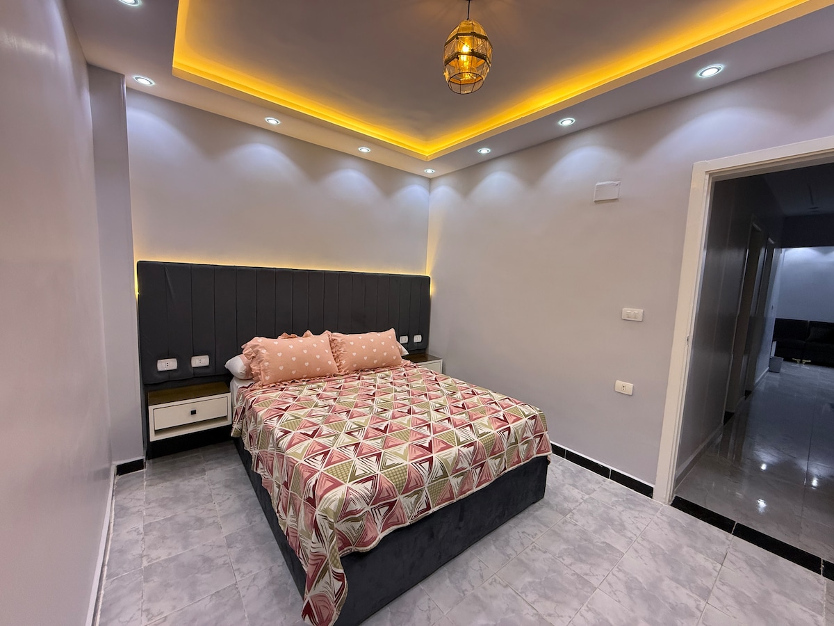 Brand new cozy apartment in El Mansoura – Talkha City. This family well-maintained apartment offers a comfortable living space for families. The apartment features 2 closed bedrooms, one with a king size bed and dressing while the other is with 2 single beds, a modern unique full bathroom, a spacious modern living room with dining table, and a fully equipped kitchen. It is fully equipped with all the amenities needed to make your stay unique and memorable. There is a smart TV, Wifi internet.