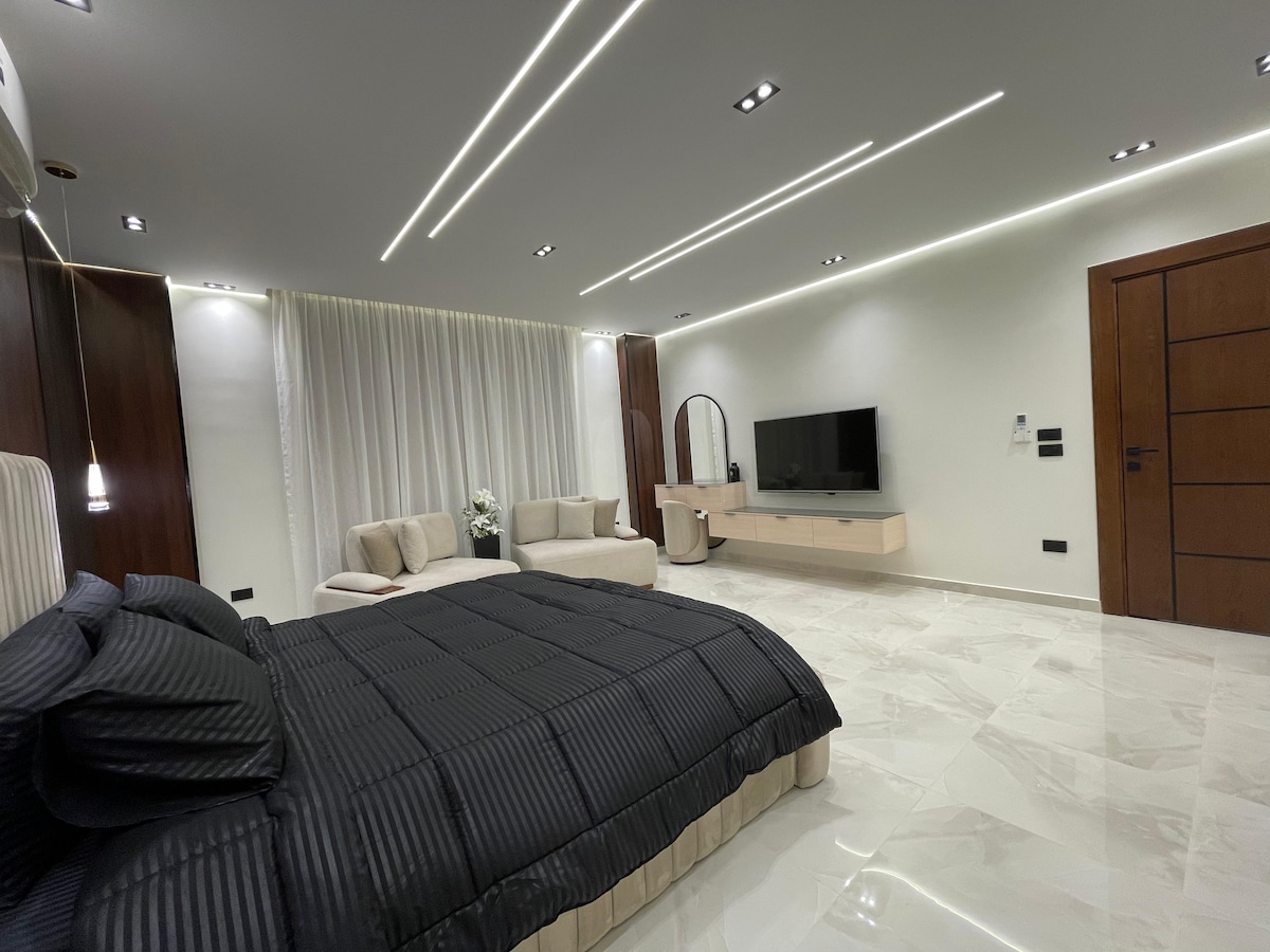 Escape to Oberoi's 9th District! Luxurious 3BR apt overlooking green spaces & main thoroughfare. Hotel-style furnishings, modern amenities. - 1 master bedroom w/ glass bathroom & dressing - 2 king-size bedrooms - 1.5 bathrooms - Full kitchen - 2 smart TVs Near Golf City Mall (10min), Cairo Airport (25min), Egyptian Museum (52min). Airport pickup/drop-off available (fee applies). Hair styling & makeup services also available (fee applies).