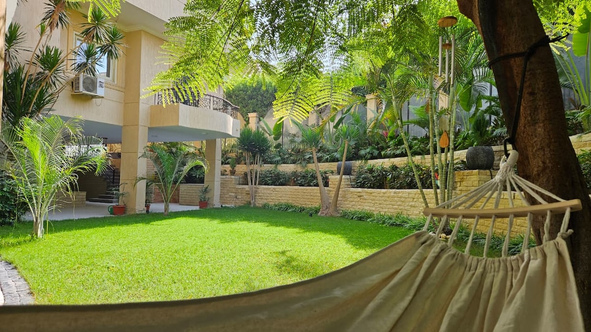 We offer: • Free Cairo Airport pickup • Gym, garden, and ping pong table • Help arranging comfortable full-day transportation to the Grand Egyptian Museum, Pyramids, or Old Cairo Explore Cairo by day and unwind away from the noise by night in this cozy, air-conditioned one-bedroom guesthouse. Enjoy a full kitchen, private living room, and direct garden access. Relax in the hammock, stay active in the gym, or play ping pong — all in a quiet, safe neighborhood just 25 minutes from Cairo Airport.
