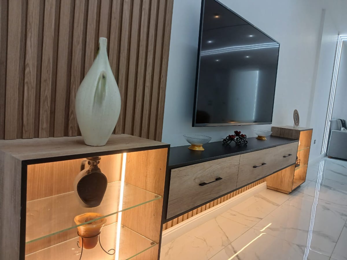 Escape to Oberoi's 9th District! Luxurious 3BR apt overlooking green spaces & main thoroughfare. Hotel-style furnishings, modern amenities. - 1 master bedroom w/ glass bathroom & dressing - 2 king-size bedrooms - 1.5 bathrooms - Full kitchen - 2 smart TVs Near Golf City Mall (10min), Cairo Airport (25min), Egyptian Museum (52min). Airport pickup/drop-off available (fee applies). Hair styling & makeup services also available (fee applies).