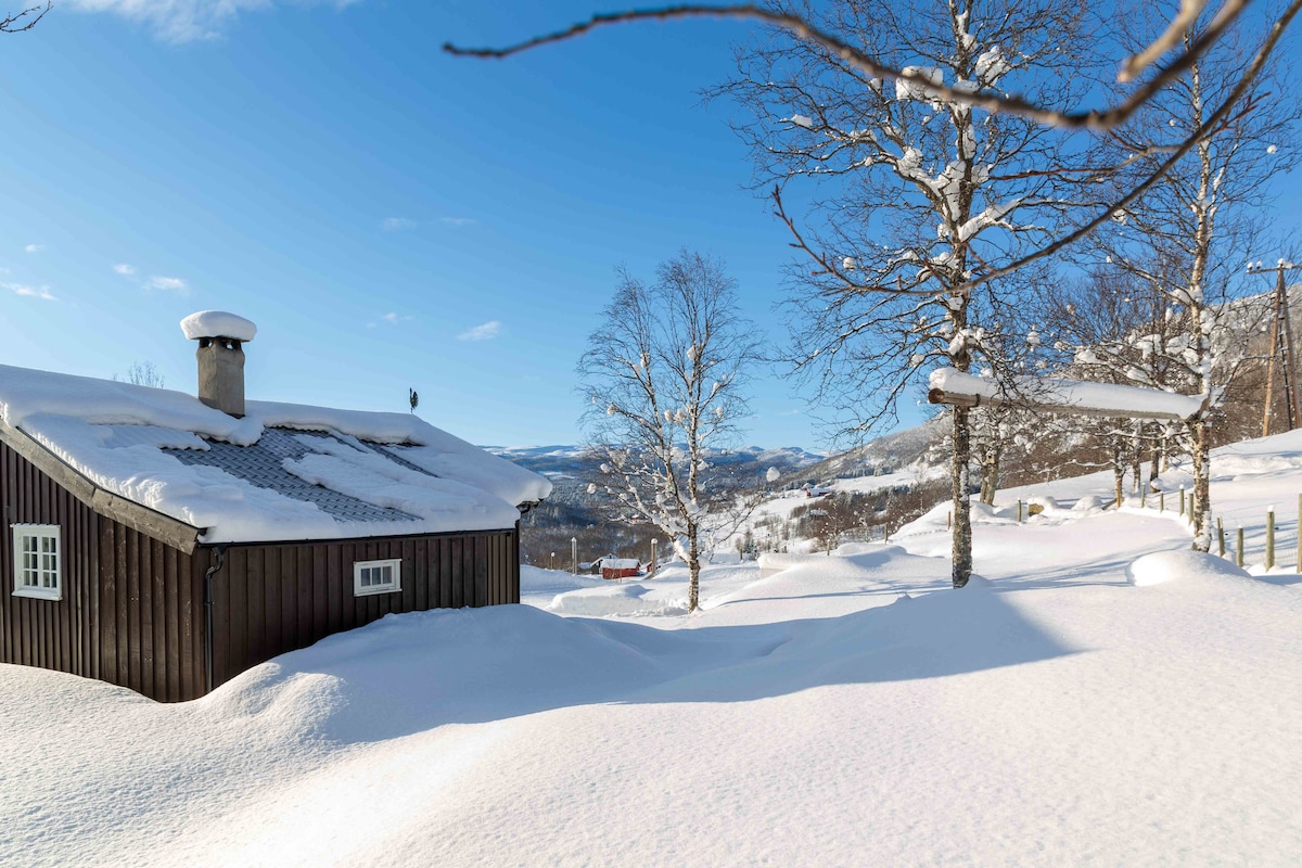 Cozy cabin built with traditional architecture from the «Hallingdal» area. Excellent sun conditions, outdoor and indoor fire place, sauna, great montain view and a hand-crafted log annex. A great place for winter and summer activities: Cross country slopes and sleding hill just outside the door, ski lifts 10 min away, cycling and hiking routes, nearby mountain farms, swim in rivers, canoo available, etc. Eating chair, changing table and sleeping bed for babies/small children available.
