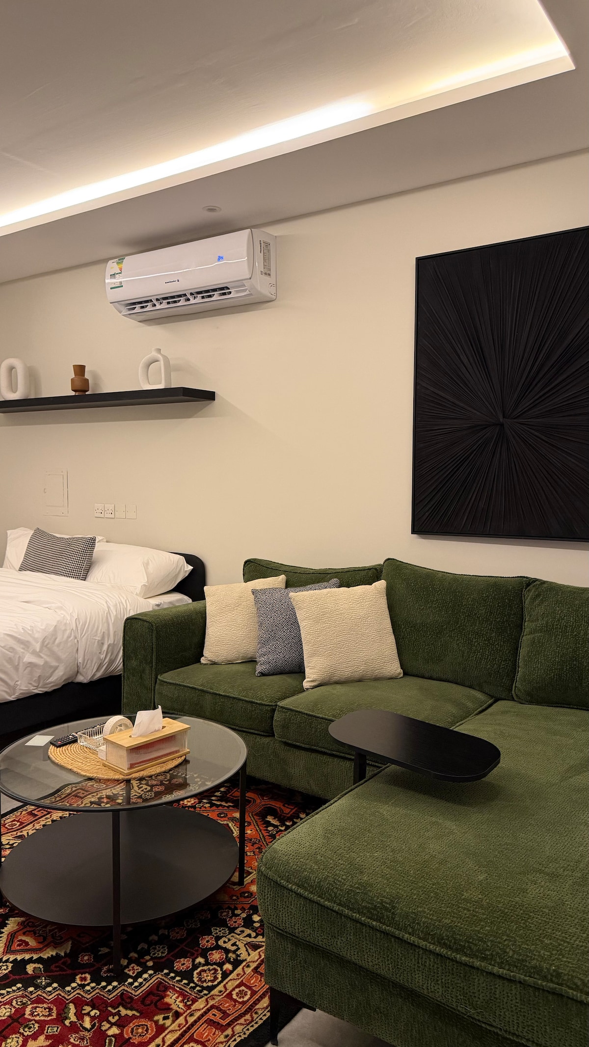Enjoy a modern stay in Riyadh’s Olaya. This stylish apartment features a private balcony with outdoor seating, a cozy bedroom with smart separation, a comfortable living area, fully equipped kitchenette, in-unit washing machine, and workspace. Just an 8-minute walk to the metro, with Al Jazirah Hypermarket right across the street. The area is vibrant and full of restaurants and cafés—perfect for food lovers and business or leisure stays.