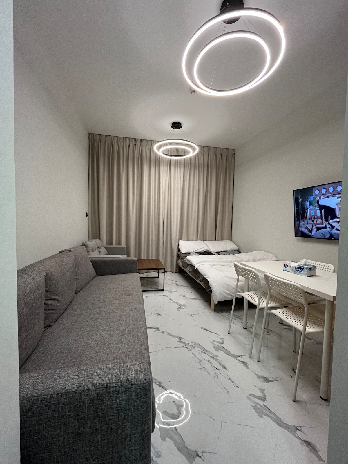 ✨ Enjoy luxury & comfort in our charming 1BR city apartment 🌆 Just steps from top attractions, this serene space offers high-quality finishes for guests seeking tranquility 🌿 Floor-to-ceiling windows fill the home with natural light ☀️ Elegantly furnished & thoughtfully designed for both relaxation & style 🛋️ Ideal for couples, solo travelers, or business stays 💼🛏️