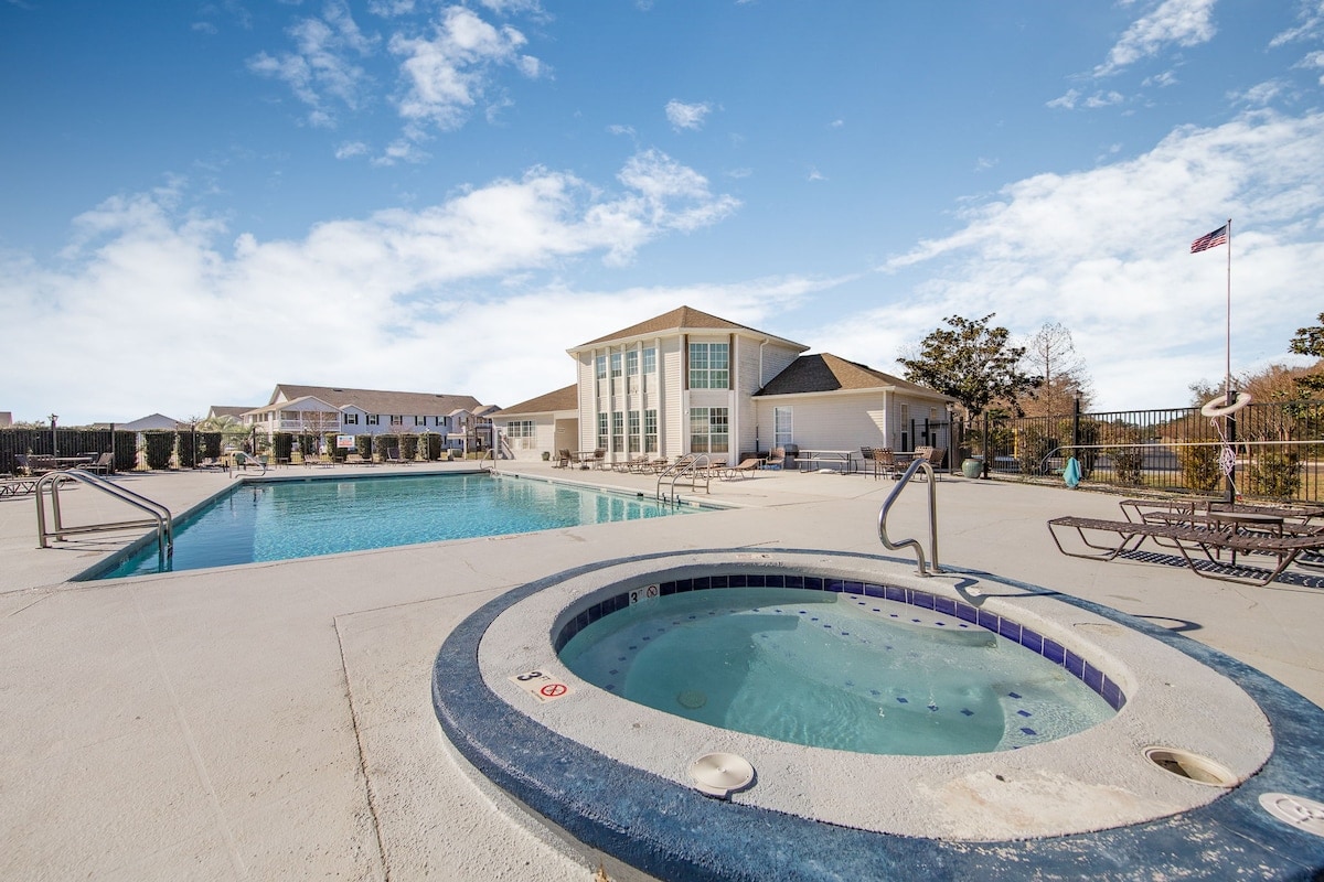 Escape the hustle and bustle and settle into this cozy 1 bedroom, 1 bath condo in Gulf Shores. Your first-floor retreat (no stairs!) has all the comforts of home, yet only 4 miles from the beaches of Gulf Shores. It's the perfect spot for 4-5 guests, boasting a King in the bedroom, a futon and twin bunkbeds. Whether you're here for a concert at the Wharf, competing at the Sportsplex(5 mins), taking the kids to OWA (5 mins), or the outlets (5 mins) you're sure to make wonderful memories here!