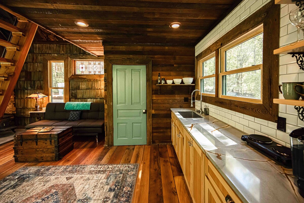 Escape to our fairytale, on 100 secluded acres of gorgeous forest on Lake Wedowee/river (short walk to water down road). Soak in the hot tub, bake a pizza in the wood-fired oven, snuggle in nest swing or stroll the river road to swim or kayak. Hike to Wolf Creek and pan for gold. This gorgeous cabin is inspired by the 1840s rock chimneys-found in the forest—built with reclaimed heart of pine, stained glass & cedar from the woods. No tv—this is a place to unplug. No kids under the age