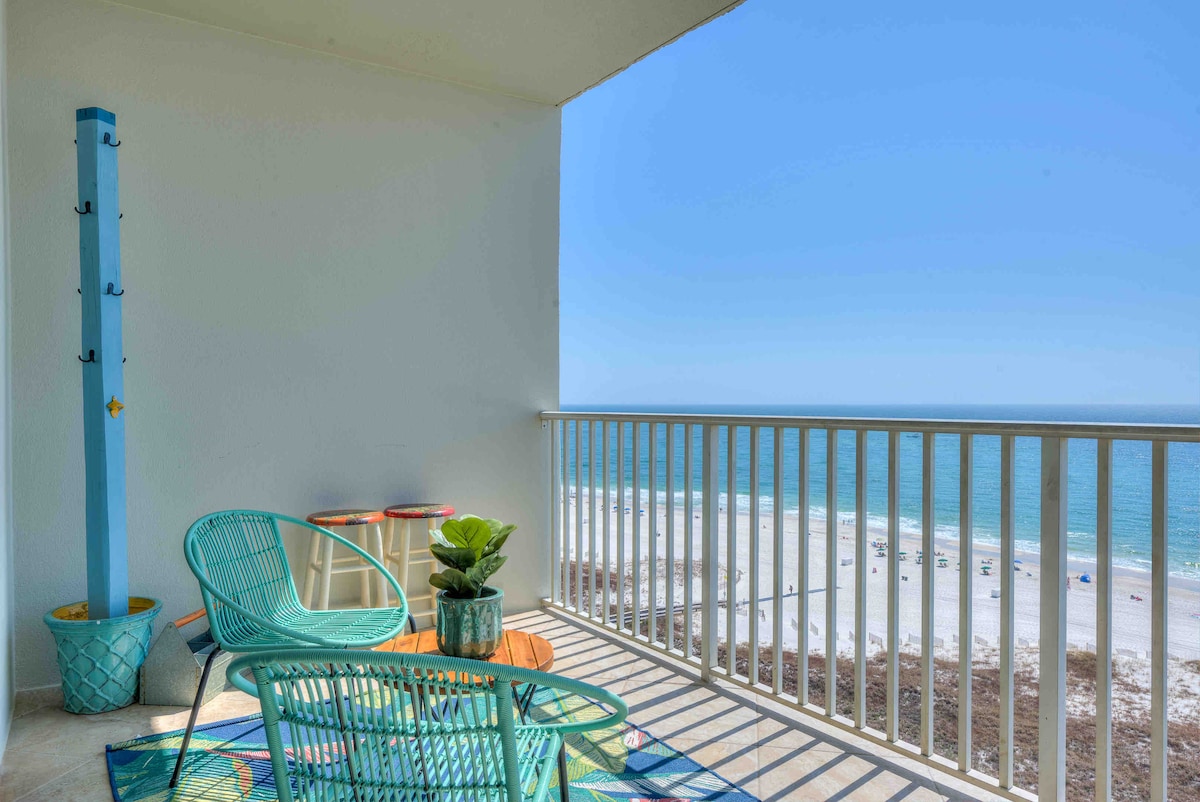 Experience the allure of Gulf Shores & breathtaking beach views from the 9th floor private balcony. Full amenities ensures an unforgettable stay. Ideal for families, work/sport events, romantic escapes, or solo adventures. Right on the Gulf of America’s sugar-sand beach, offers convenient proximity to the State Pier, the Hangout, and beachside restaurants. Reserve Now! *** Military discount available for active/retired military and veterans Royal Palms 902 is privately owned and managed