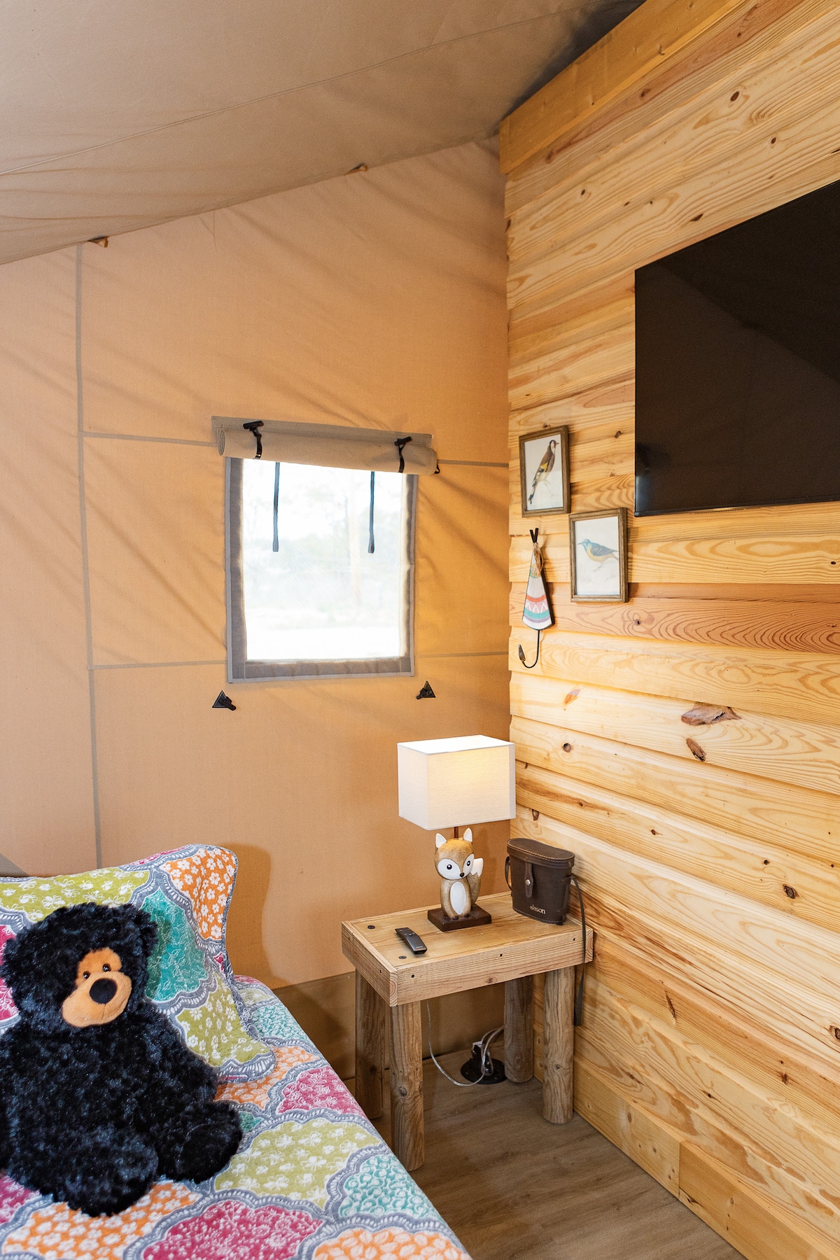 Luxurious Canvas Tent, designed to sleep 2, featuring a Full bed with luxury linen, full bath with shower. Includes front porch seating and all the every day essentials like a kitchenette with coffee station and mini fridge, heating and air, designated parking for two vehicles. No animals or pets allowed.