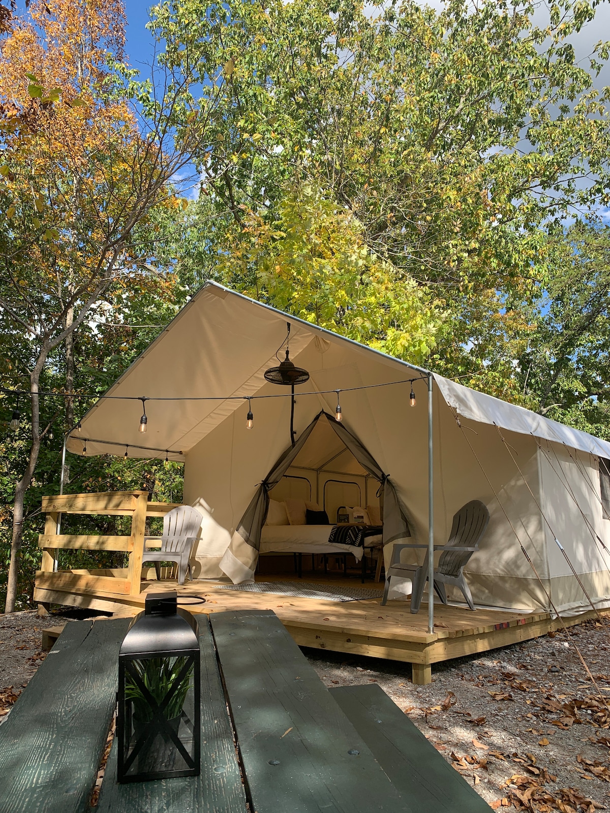 Reconnect with nature at this unforgettable escape. 16x20 wall tent with an 8ft private deck. Look out over our 44 acres of wooded beauty. Short walk to the climate controlled bathhouse. Climate controlled tent with ceiling fan, min fridge, coffee maker, king size bed and 2 sets of twin size bunk beds. Deck seating for 6. With a bistro table inside that has two chairs.