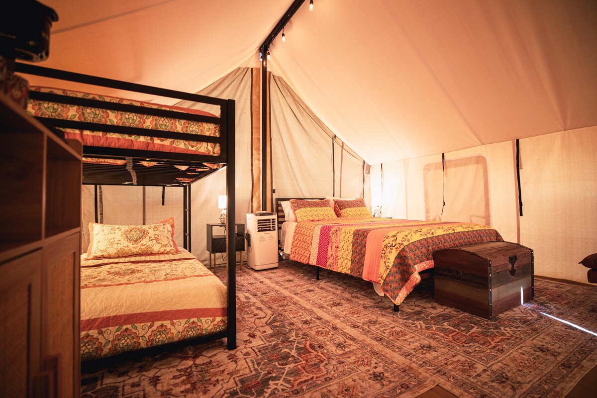 Reconnect with nature at this unforgettable escape. 16x20 wall tent with an 8ft private deck. Look out over our 44 acres of wooded beauty. Short walk to the climate controlled bathhouse. Climate controlled tent with ceiling fan, min fridge, coffee maker, king size bed and 2 sets of twin size bunk beds. Deck seating for 6. With a bistro table inside that has two chairs.
