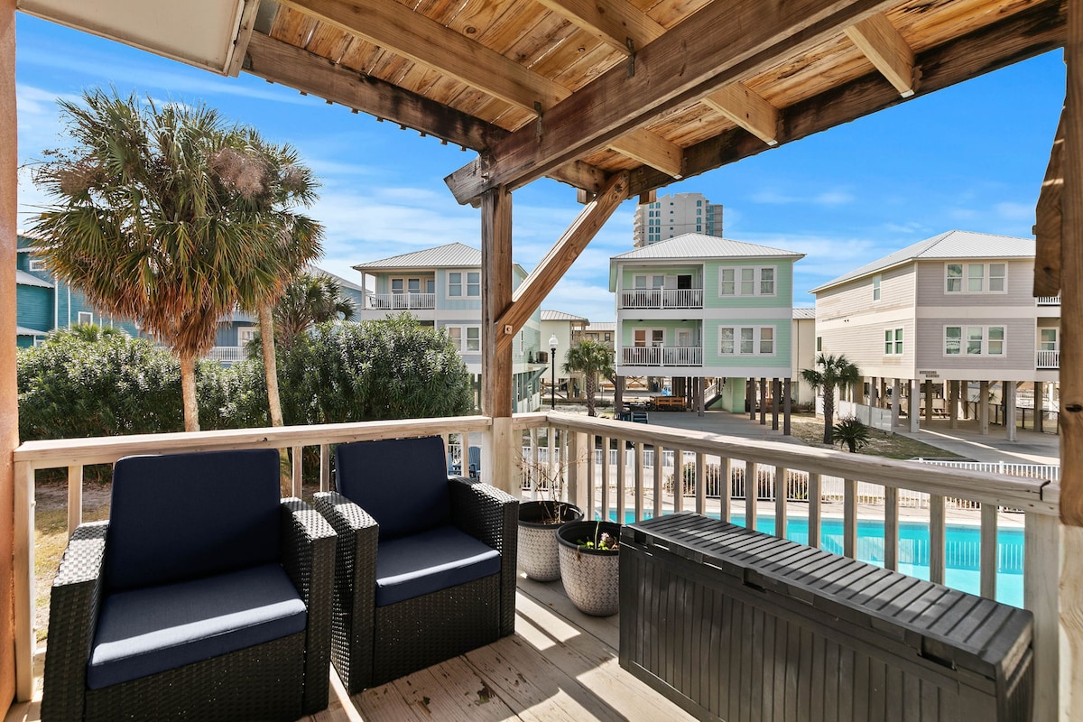 Townhouse on the beach, 50 steps to the pool, and 50 more steps to the beach (no road crossing). Walking distance to the center of Gulf Shores. Lively beach decor, full kitchen, laundry, and two balconies to enjoy side views of the pool and beach. Balconies and windows face towards windowless wall providing privacy for our unit. Private carport attached to unit with direct access stairs. Two large bedrooms with en-suite baths. Additional full size inflatable bed, and inflatable tw