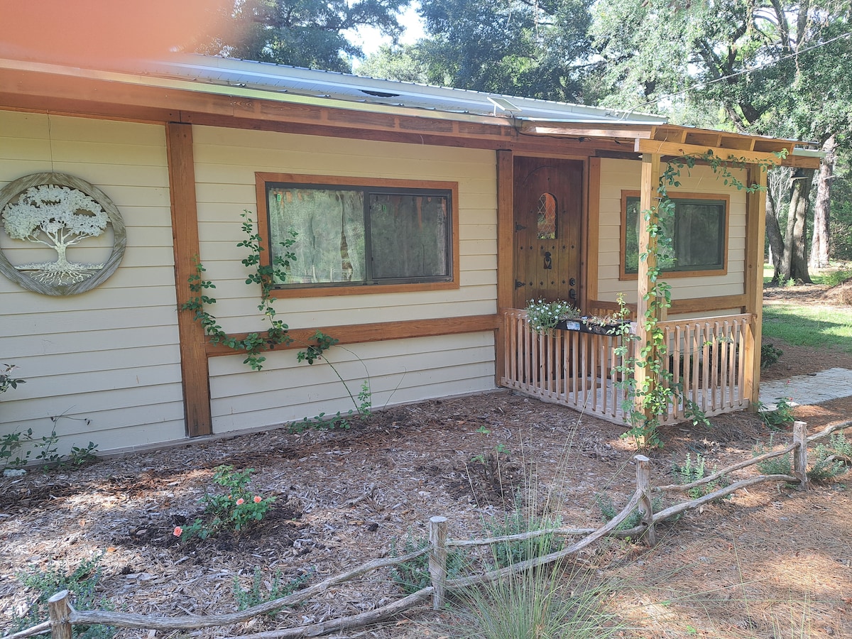 Crazy Oaks Cottage is off the beaten path, yet a few minutes drive to all Gainesville offers. The house is on an acre, nestled in the woods. Across the road is a beautiful horse farm, maintained by UF. We are close to hospitals and UF campus. Our area is known for a variety of bird species! With very little traffic on the road, it's perfect for our guests with dogs. Morning views are misty and peaceful, and you may glimpse the deer that frequent our yard. Come home to Serenola Hammock!