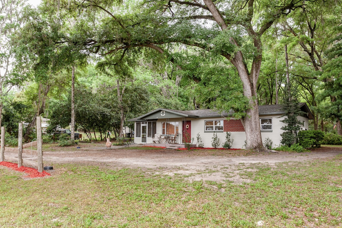 ↞----- Newly-Renovated ~ Family-Friendly Farm Getaway -----↠ ▻ Near world-famous freshwater Springs (Ginnie Springs, Blue, Ichetucknee) ▻ Sun-drenched Sunroom, ideal for gatherings or game nights ▻ Backyard Fire Pit, igniting cozy evenings Under the Stars ▻ Cozy all-wood cabin-style Rural Retreat to rest and recharge