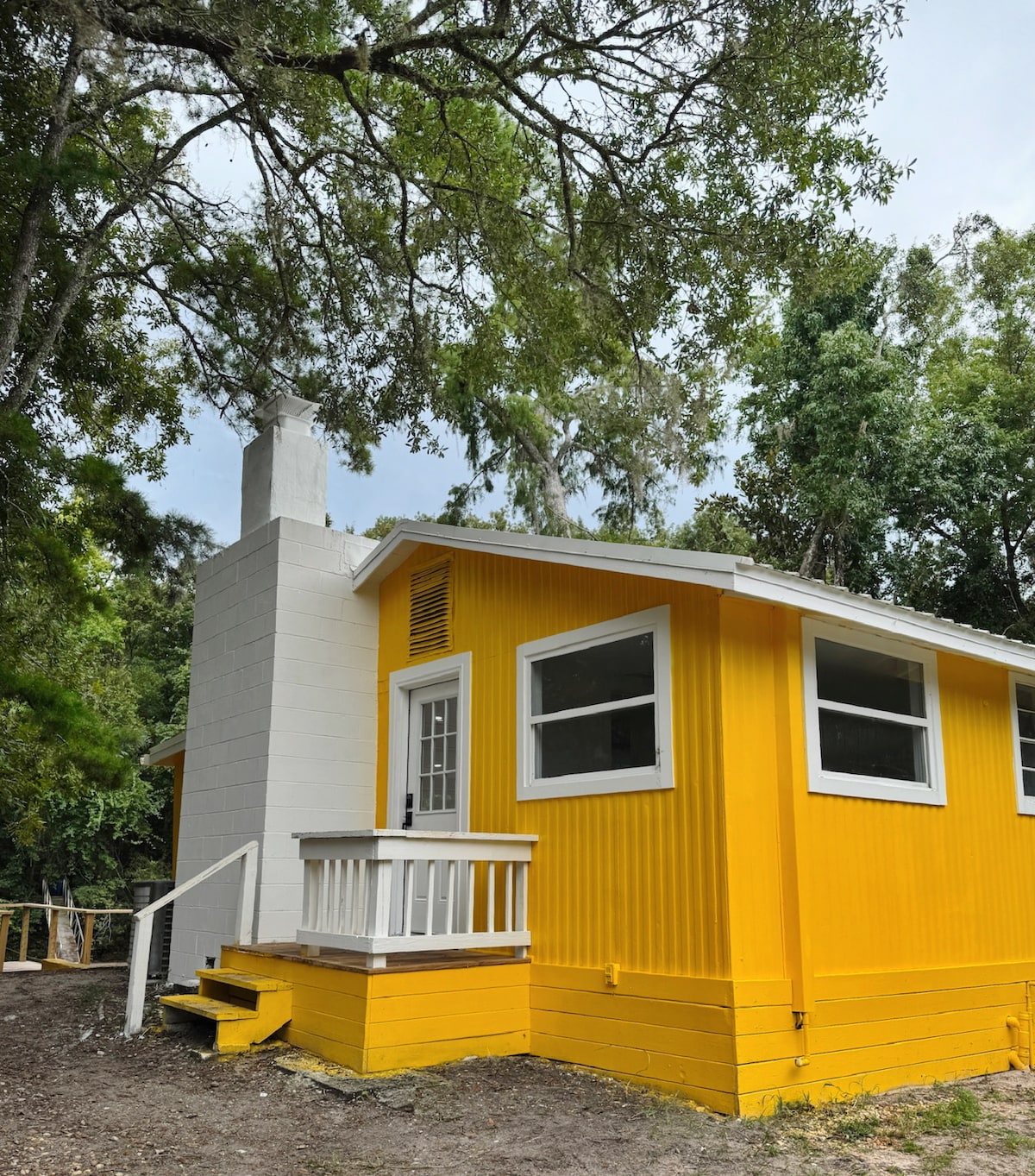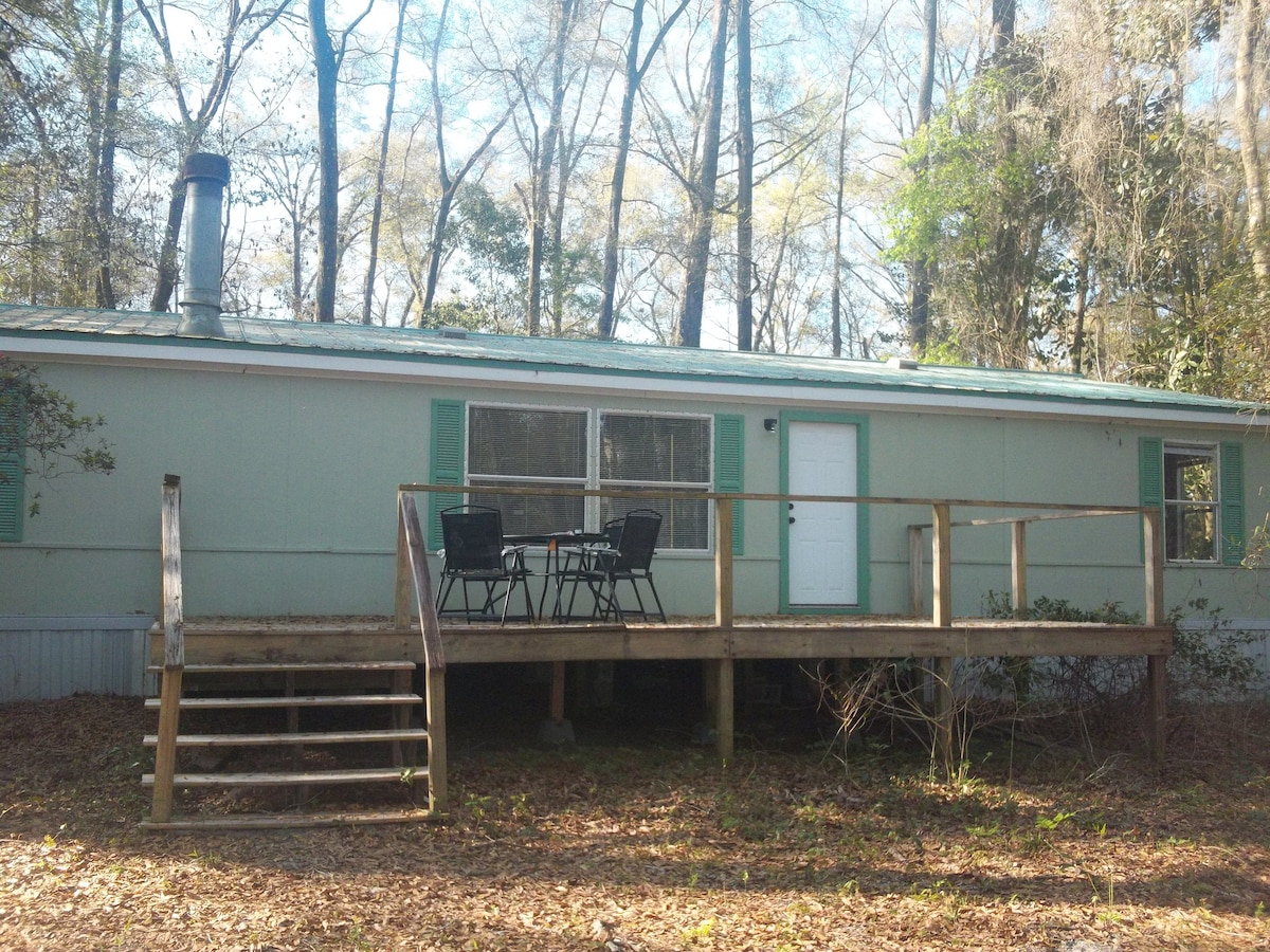 In natural woods . Near world class springs for diving ,snorkeling. Dive shops , kayak rentals ,river three miles away . After a day on the water, enjoy your quiet get away on wooded 10 acres .Oleno State Park , 1 mile away for hiking, biking , picnicking along the Santa Fe river .High Springs ,four miles away, has lovely restaurants and shops. Extra room has a treadmill ,exercise bike. Porch has deck chairs ,gas grill. .Dozens of dvds to choose from. NO wifi . SUPERVISED children .