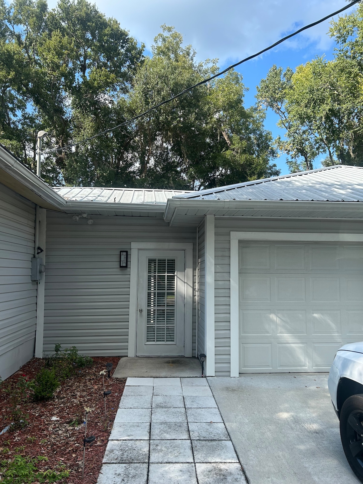 Cute, cozy, freshly remodeled, private guest house on a beautiful 5 acre farm. Enjoy your own backyard herb garden with privacy fence, picnic table and fire pit. New kitchen with gas stove, microwave, toaster oven, coffee-maker, and dining area perfect for enjoying meals. The bedroom is equipped with a smart TV, queen bed, & extra blankets. This country getaway is near the University of Florida (12 miles), Blue Springs (21 miles) Ginnie Springs (24 miles), and historic High Springs (15 miles).