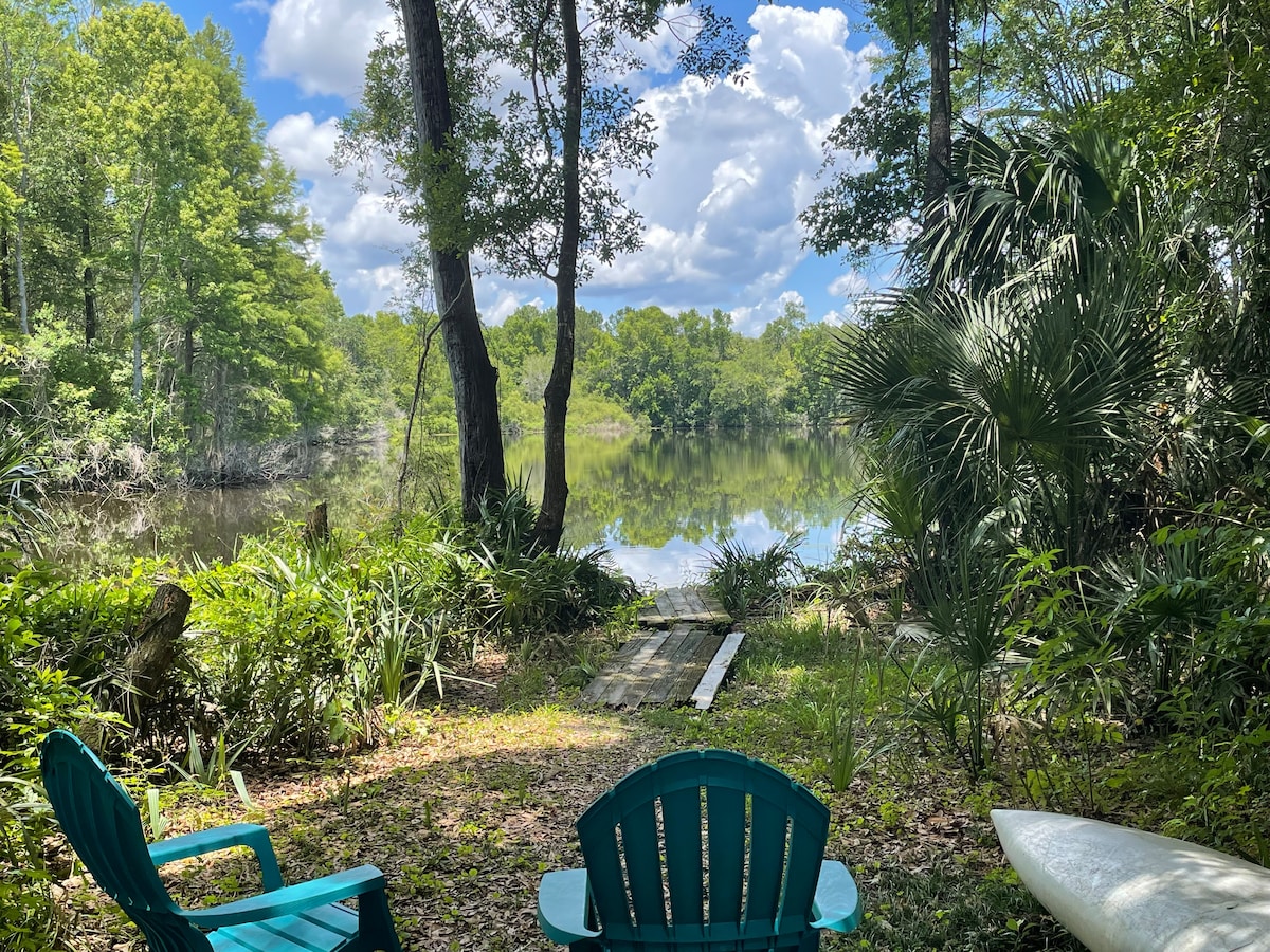 Our front yard is the Santa Fe River. Come enjoy a nature retreat in this cypress log home! Right by Tree House spring and nestled between two state parks, but less than five minutes to downtown. Whether you are looking for rest and relaxation or recreation, our home offers both. Take in the scenery and catch your dinner from the riverbank. Recline in the sunshine on our dock (12’ x 12’). Keep an eye out for otters! It is a two hour float downriver to Poe Springs, Rum Island, and Blue Springs.