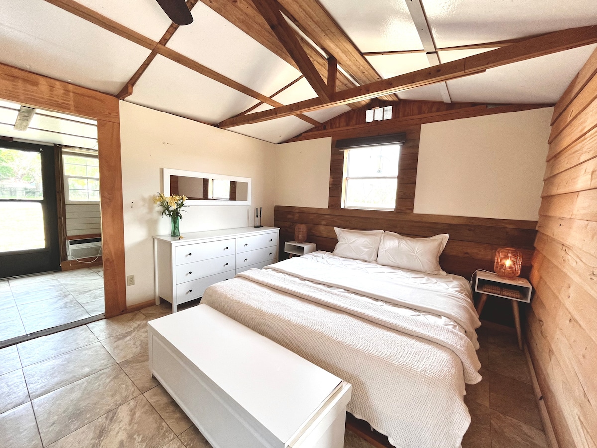 The Studio is a private guest suite featuring luxury amenities. This open-concept retreat is centrally located with a private courtyard. Inside, enjoy a blend of modern and mid-century design, with glass sliders that create an inviting indoor-outdoor feel. Amenities include an LED vanity mirror, stainless steel towel warmer, Bluetooth speaker, glass dining table, convertible sleeper sofa, suspended pod chair, and Google Home display for added convenience.